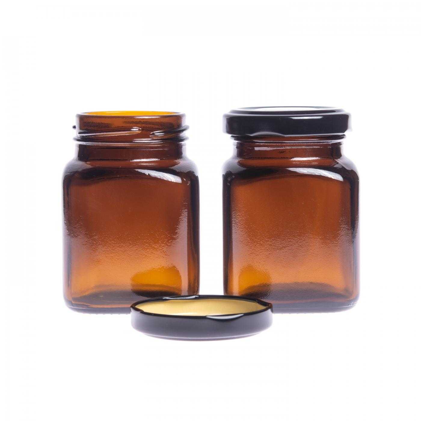 Pot en verre épais brun foncé avec couvercle en aluminium noir d'une capacité de 155 ml, adapté au stockage de crèmes, pommades, émulsions ou sérums.Il convient également à la fabrication de bougies.Matériau : verreCouleur : brun foncéVolume : 155 ml