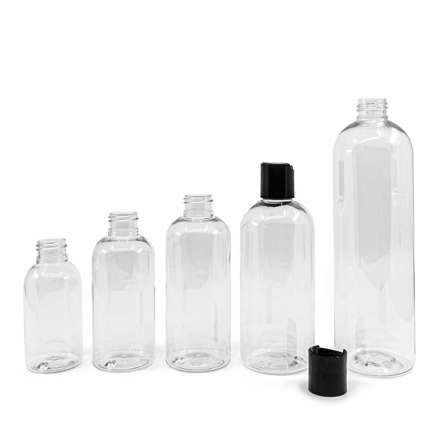 Bouteille arrondie en plastique transparent, bouchon à disque noir, 150 ml