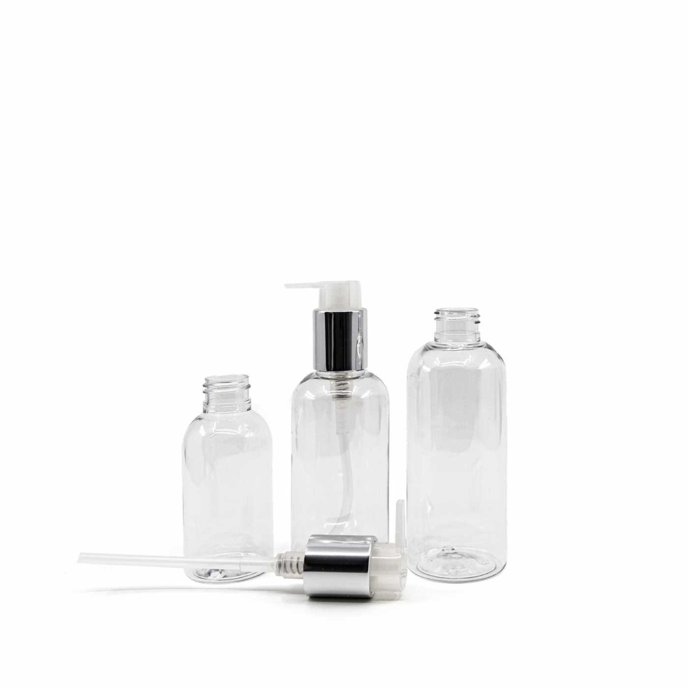 Bouteille arrondie en plastique transparent, pompe argentée, 200 ml