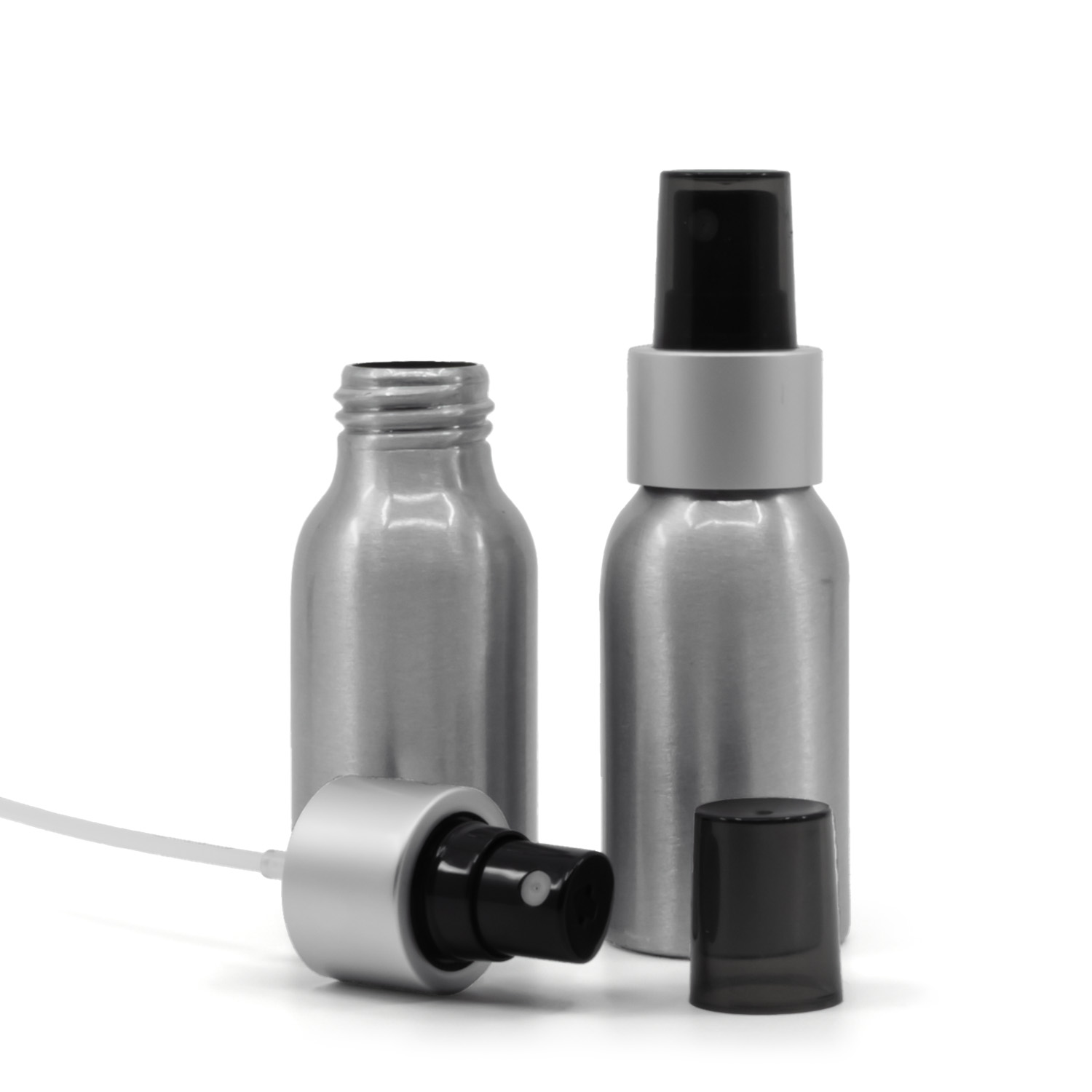 Bouteille en aluminium, spray noir, col argenté mat, bouchon fumé, 50 ml