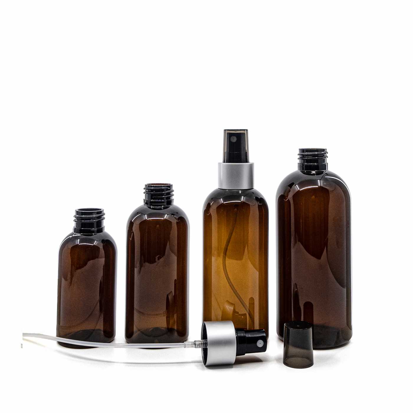 Bouteille en plastique ambrée, spray noir, col argenté mat, bouchon fumé, 150 ml