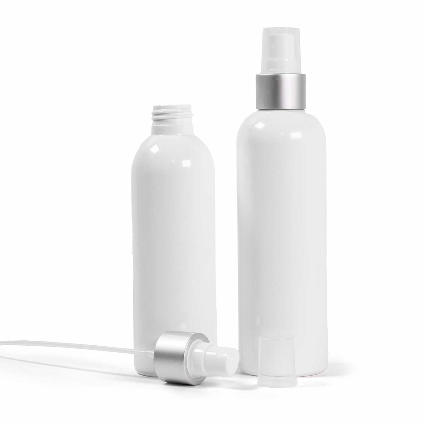 Flacon pulvérisateur en plastique blanc avec couvercle transparent et col en finition argent mat d'un diamètre de 24 mm.
