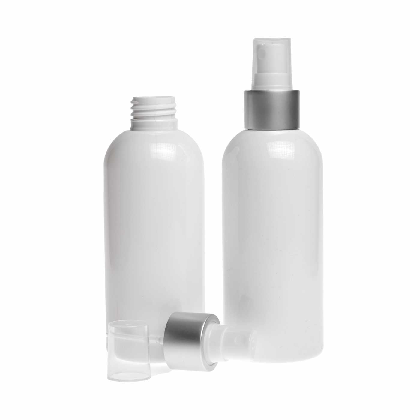 Bouteille en plastique blanc, spray blanc avec col en argent mat, 300 ml