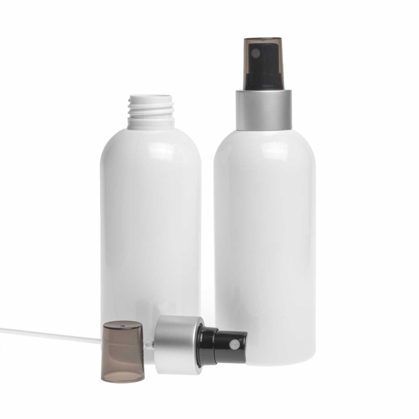 Vaporisateur en plastique noir avec couvercle transparent noir et col argenté mat d'un diamètre de 24 mm.