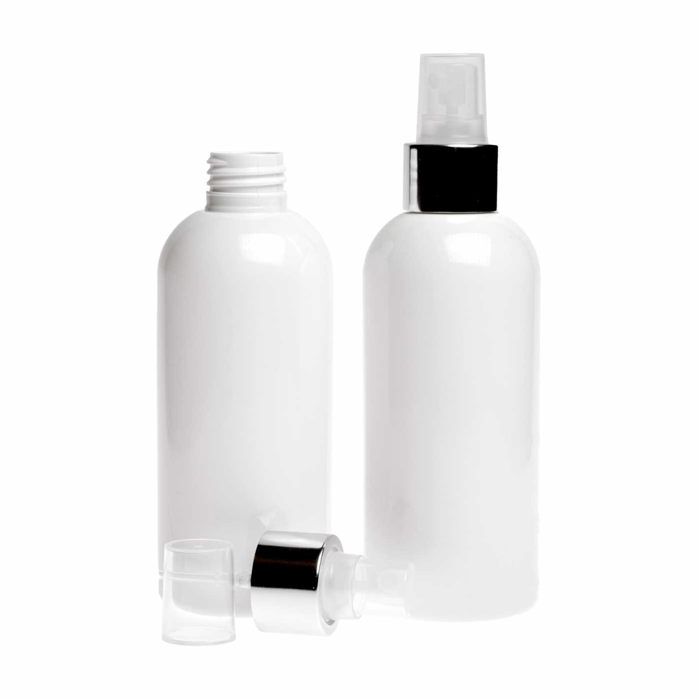 Vaporisateur en plastique transparent avec couvercle transparent en argent brillant d'un diamètre de 24 mm.