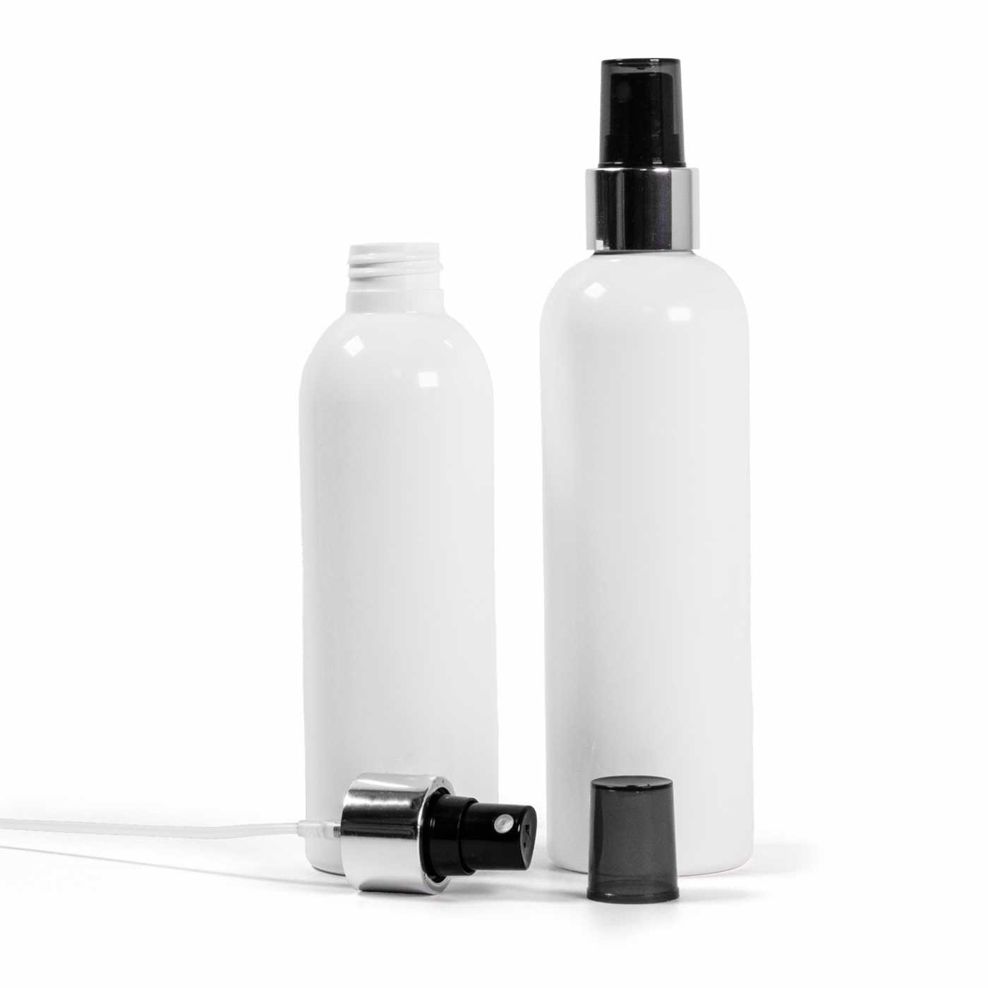 Vaporisateur en plastique noir avec bouchon transparent et col argenté brillant d'un diamètre de 24 mm.
