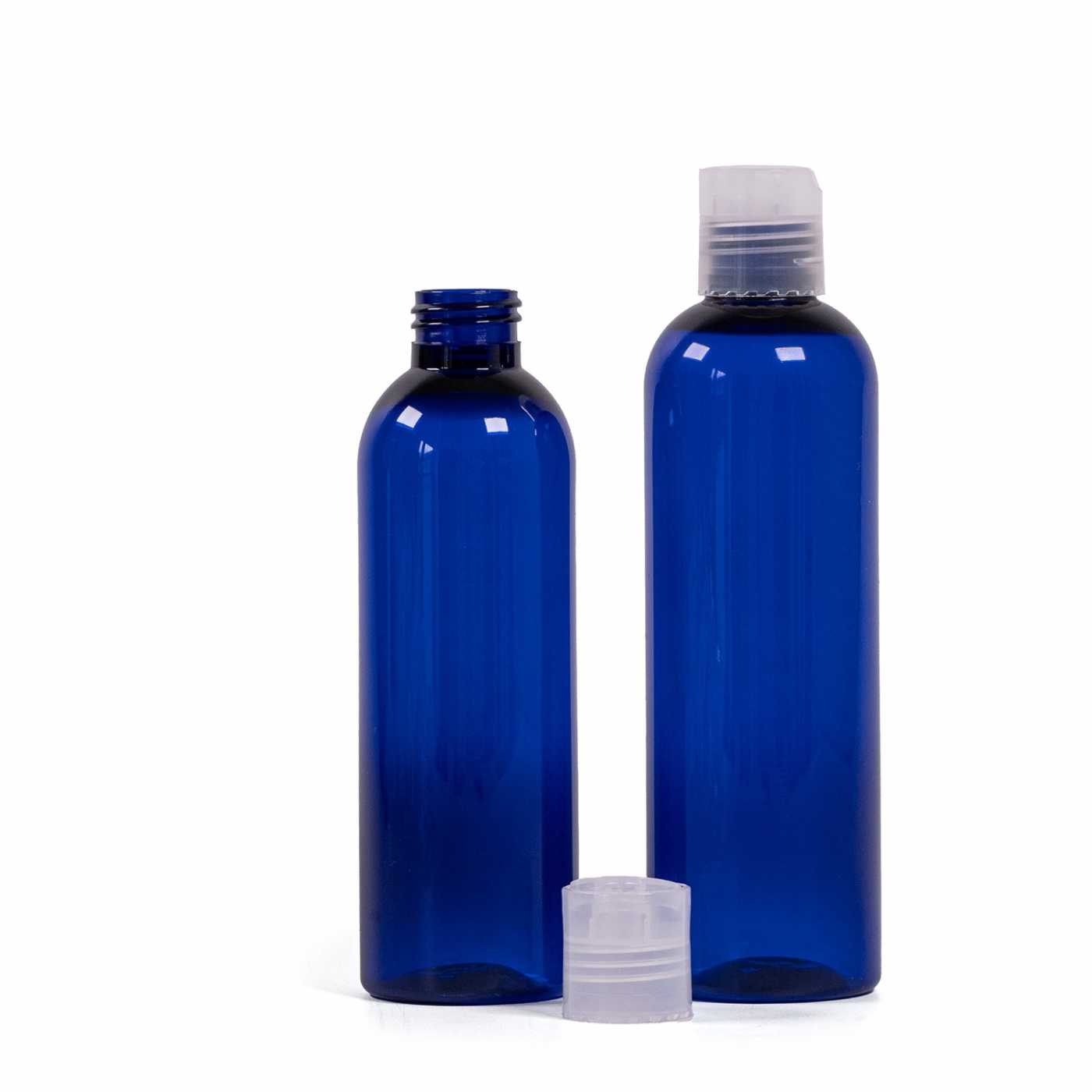 Bouteille en plastique bleue, bouchon transparent, 250 ml