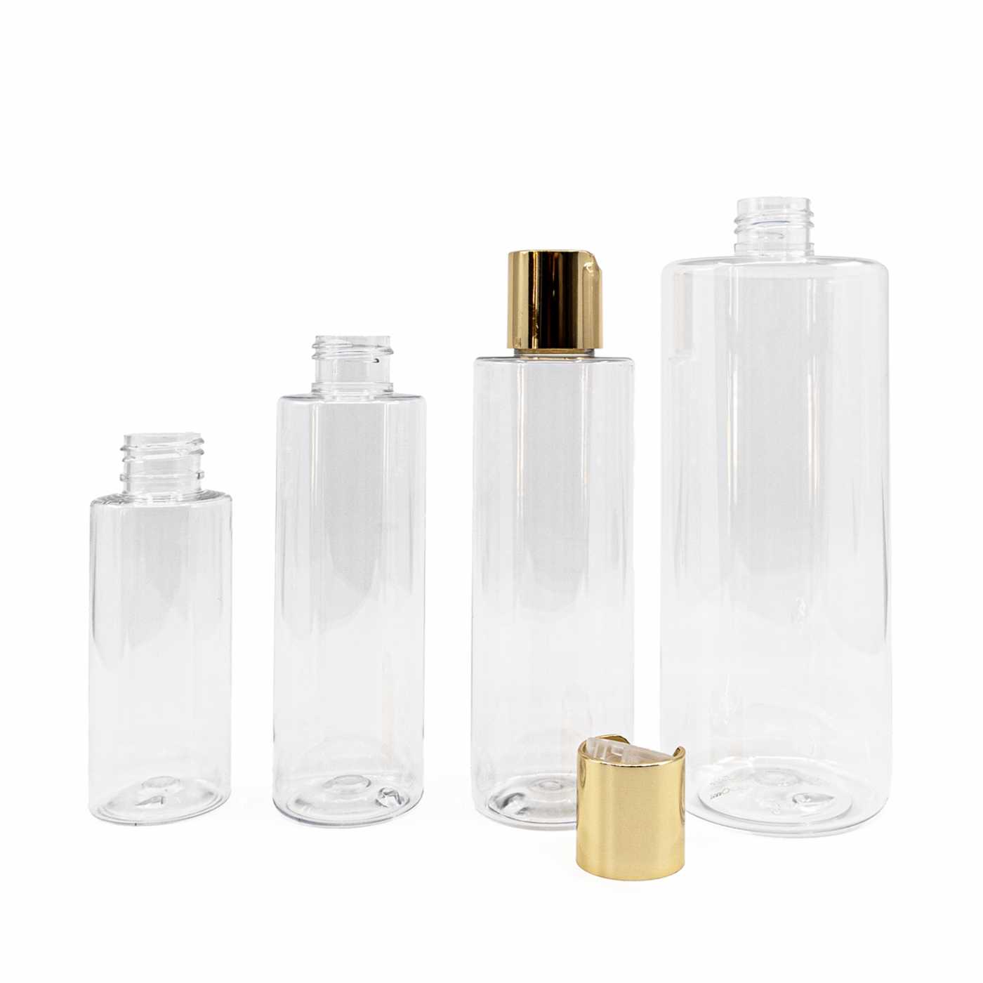 Bouteille en plastique transparent, bouchon à disque doré, 100 ml
