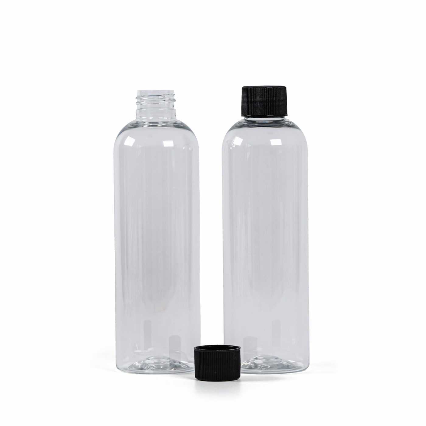 Bouteille en plastique transparent, bouchon en plastique strié noir, 250 ml
