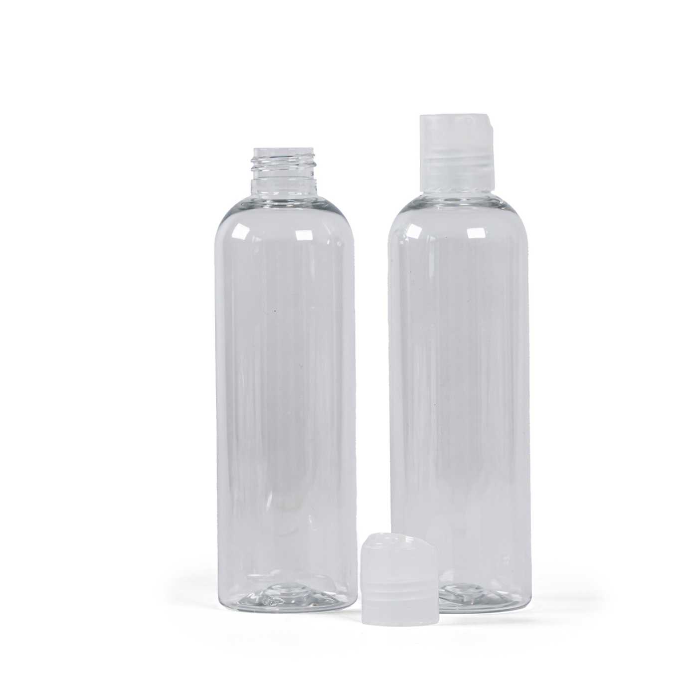 Bouteille en plastique transparent, idéale pour le stockage de divers liquides, huiles, lotions, etc. Elle est semi-rigide, mais peut être pressée.