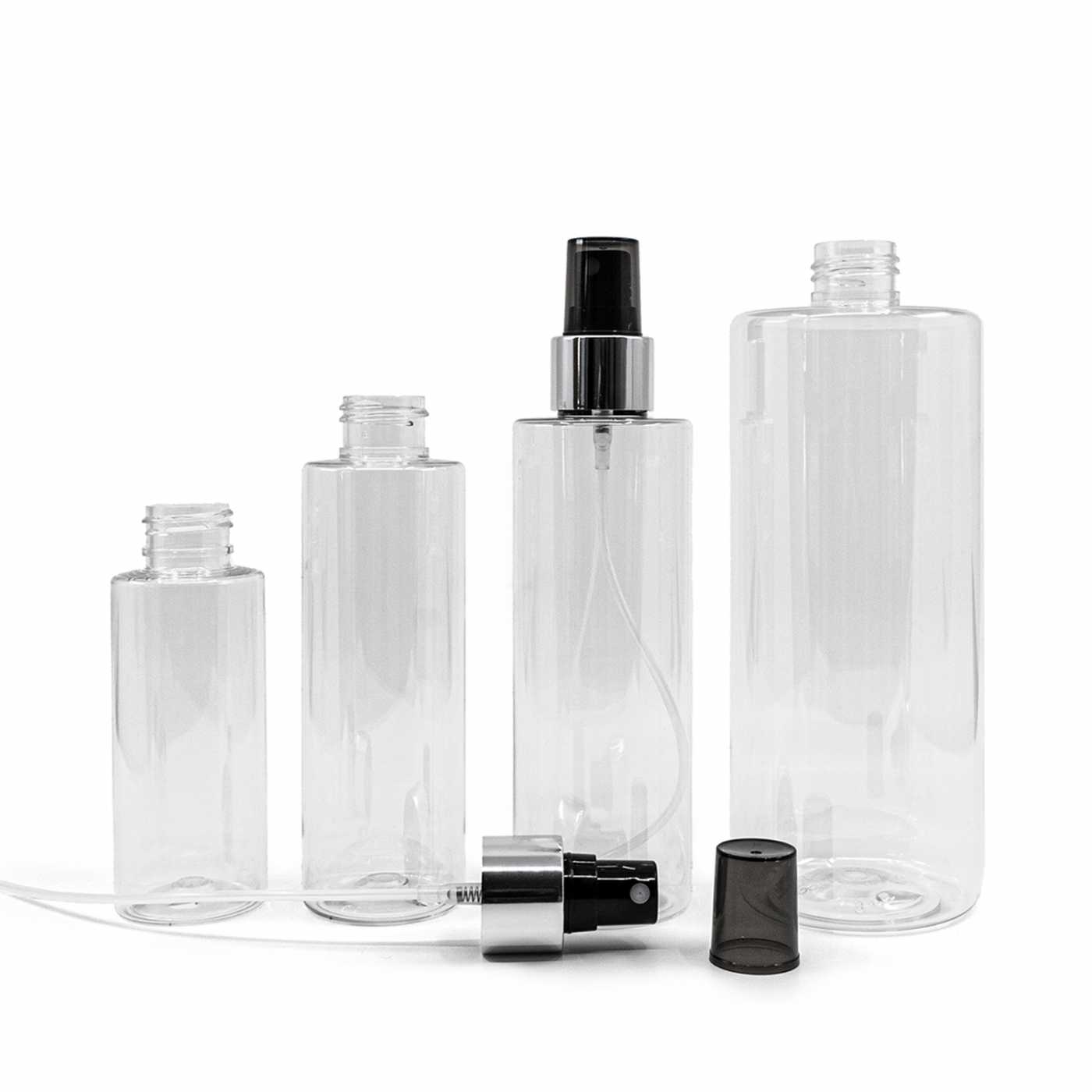 Vaporisateur en plastique noir avec bouchon transparent et col argenté brillant d'un diamètre de 24 mm.