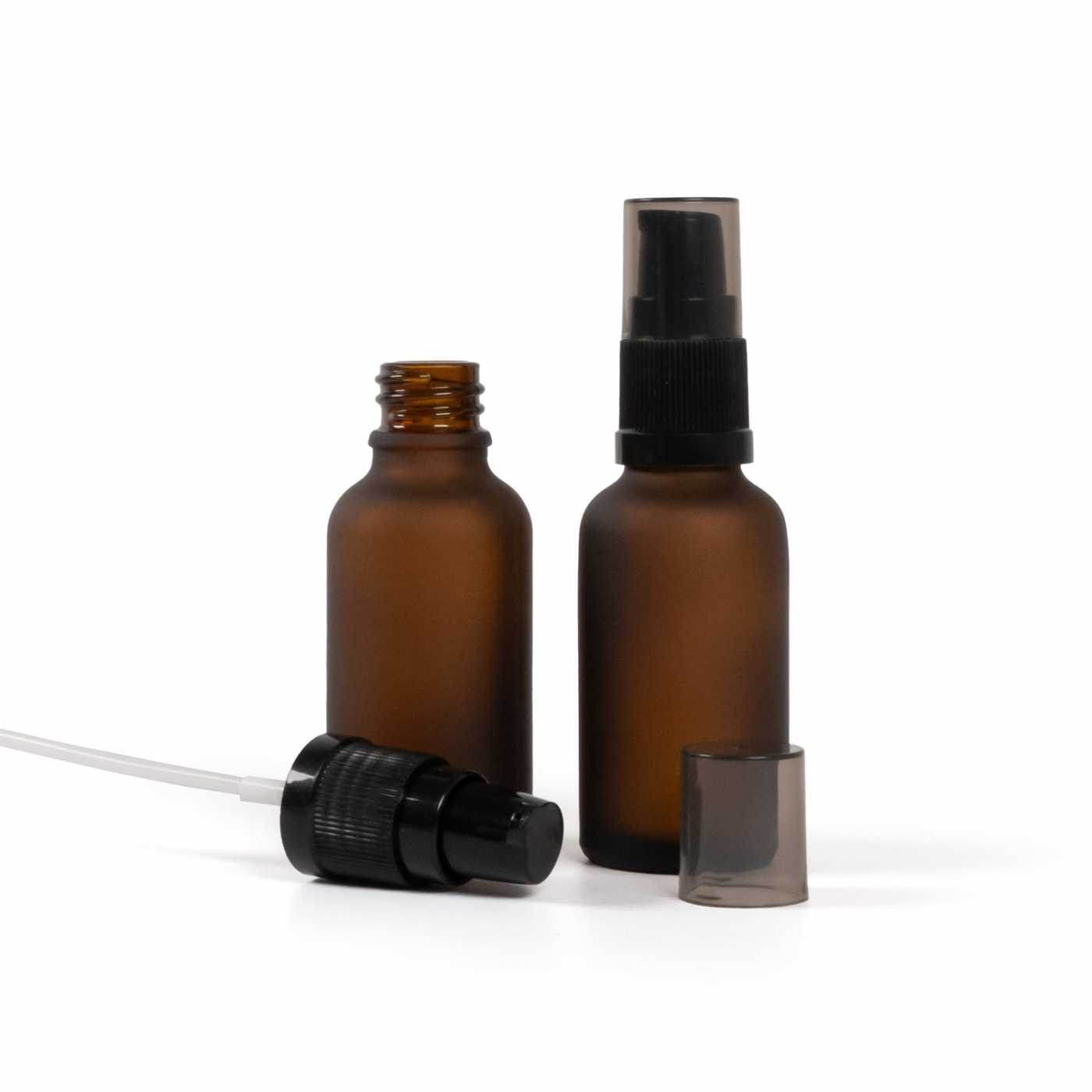 Bouteille en verre ambré mat, pompe à lotion noire avec bouchon fumé, 30 ml