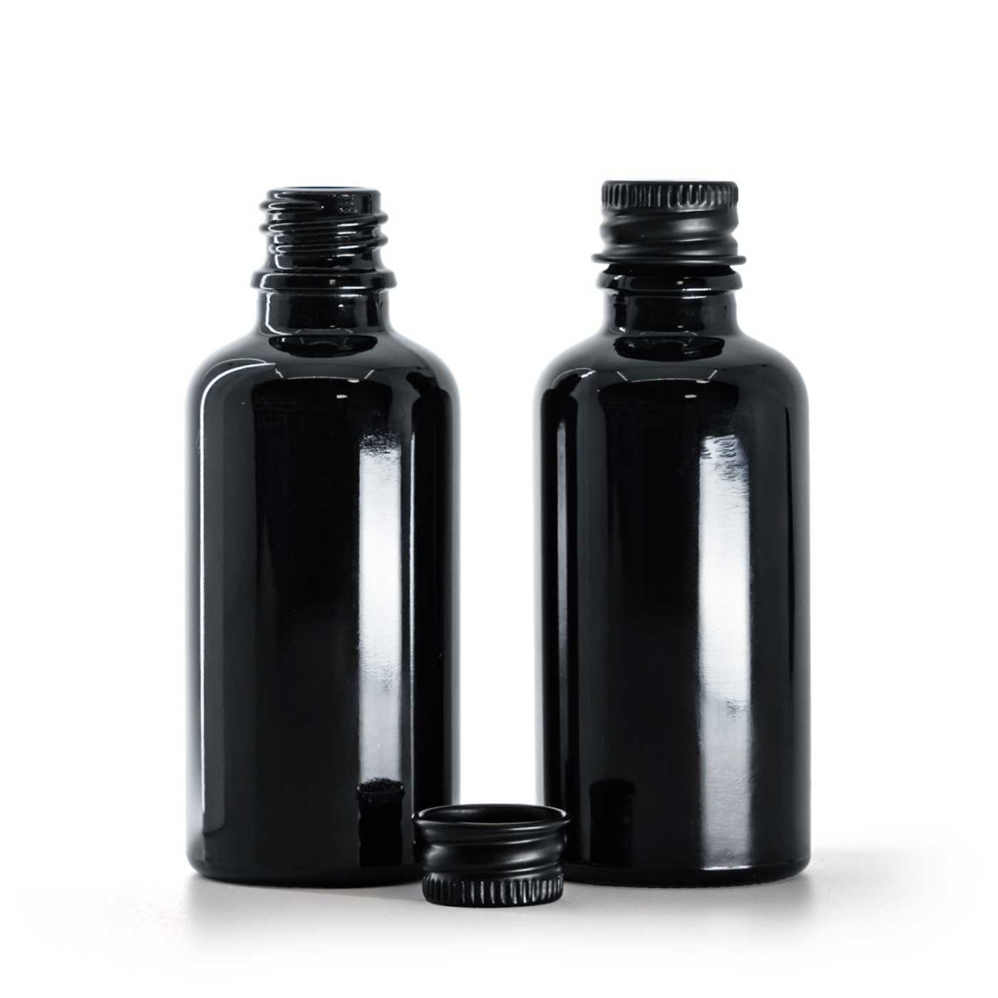Le flaconen verre est fabriqué en verre noir de haute qualité avec une surface brillante. Cela garantit que la lumière ne pénètre pas dans le flacon et offre ainsi une protection contre les rayons UVA et UVB.