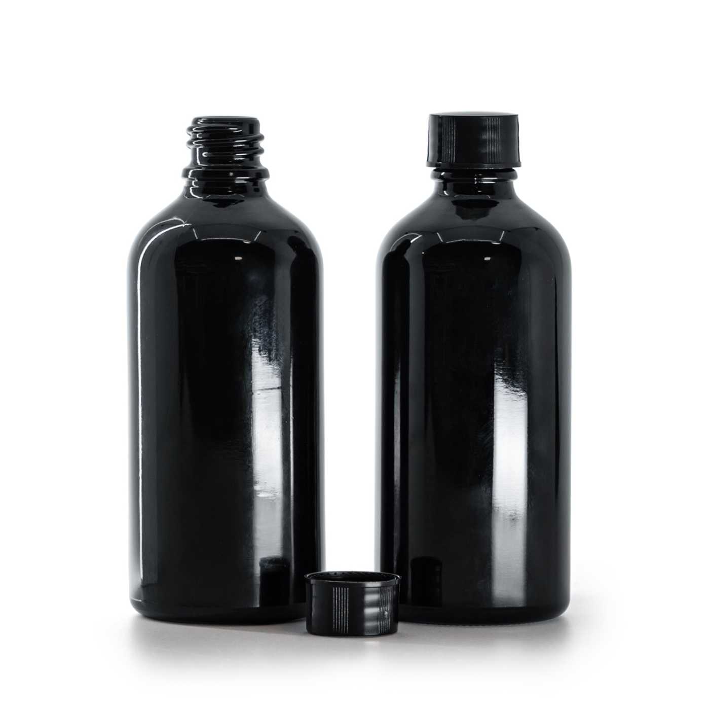 Bouteille en verre noir brillant, bouchon noir, 100 ml