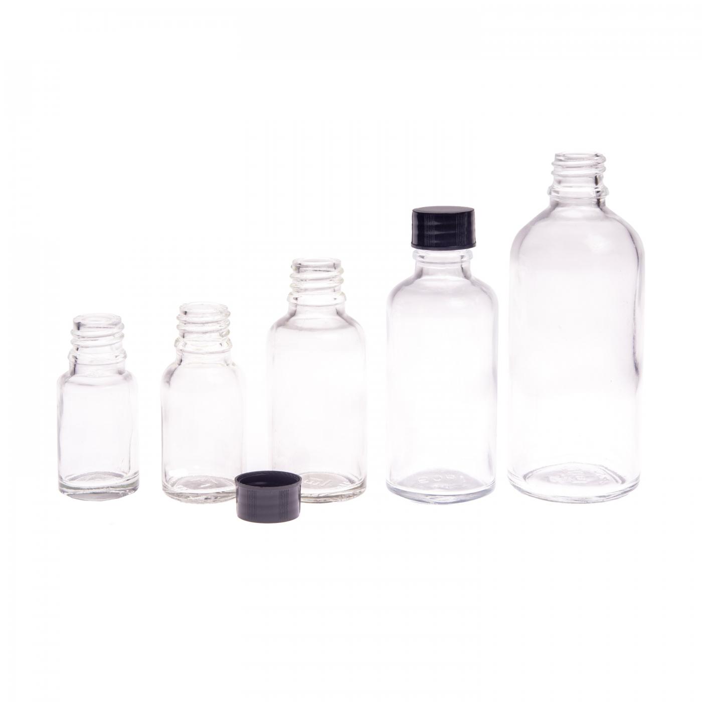 Bouteille en verre transparent, bouchon noir, 50 ml