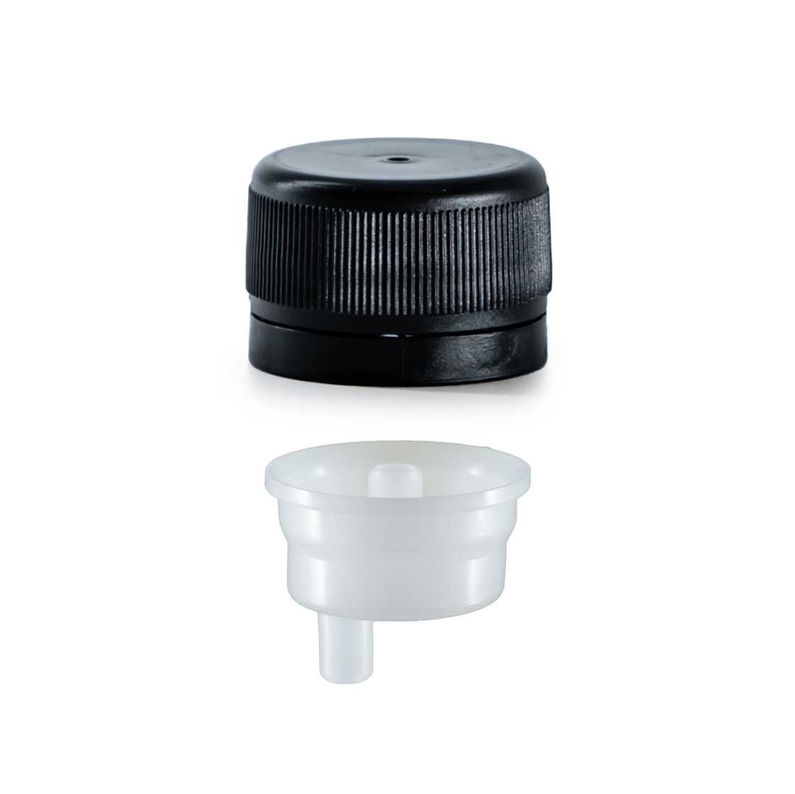 Bouchon en plastique noir avec compte-gouttes transparent, adapté aux flacons avec un col de 28 mm.