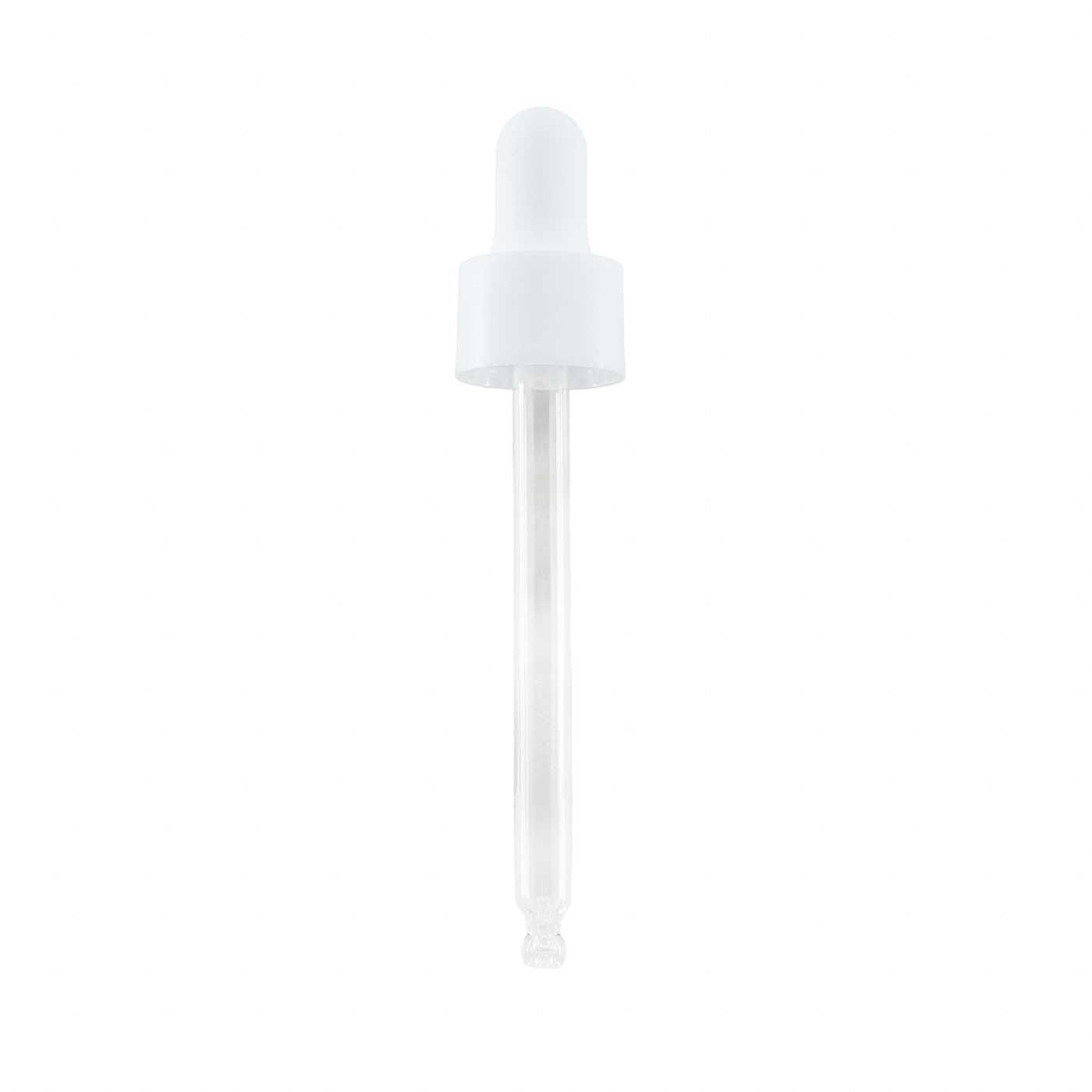 Compte-gouttes en plastique blanc givré, adapté aux flacons ayant un diamètre de col de 18 mm et un volume de 30 ml.Longueur du tube en verre : 71 mm