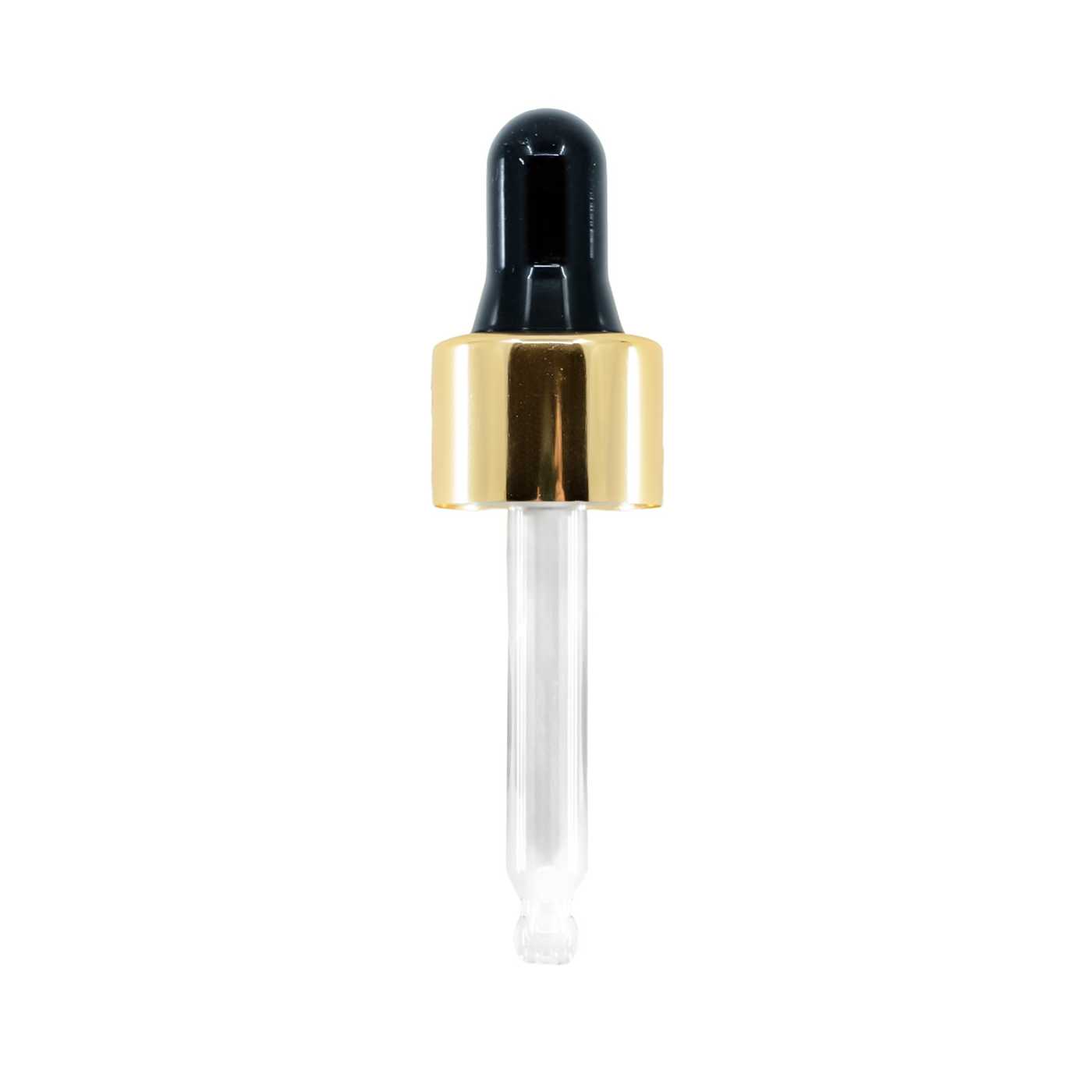 Compte-gouttes en verre, noir/doré brillant, adapté aux flacons avec un diamètre de col de 18 mm et un volume de 10 ml. Longueur du tube en verre : 53 mmMatériau : verre, silicone, aluminium, plastique