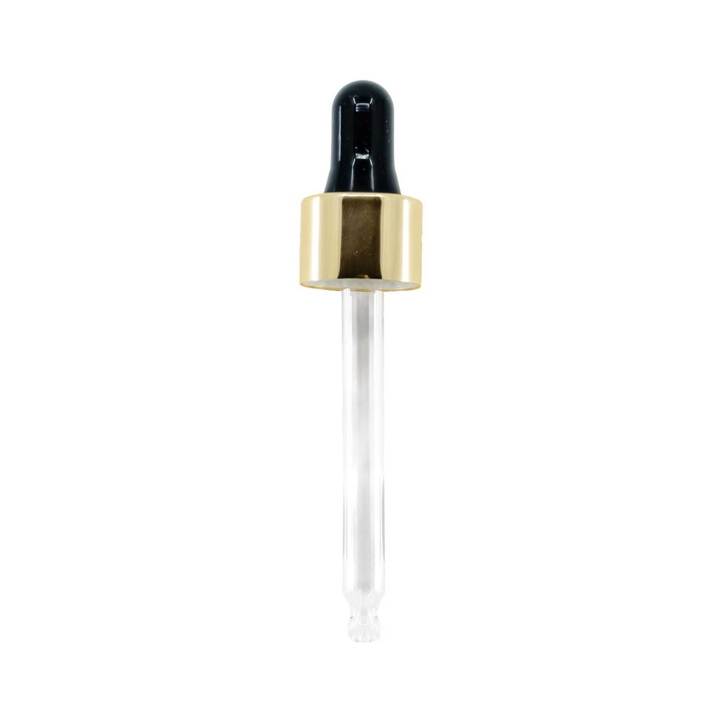 Compte-gouttes en verre, combinaison noir/doré brillant, adapté aux flacons avec un diamètre de col de 18 mm et un volume de 30 ml.Longueur du tube en verre : 71 mmMatériau : verre, silicone, aluminium, plastique