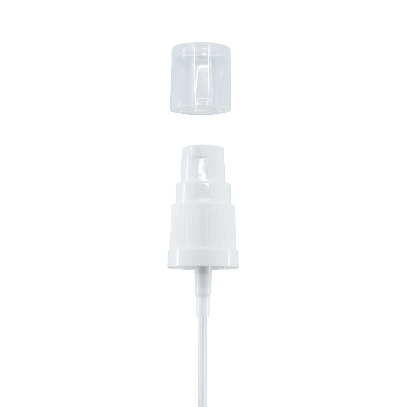 Distributeur de crème en plastique blanc avec bouchon transparent. Convient aux bouteilles ayant un diamètre de col de 18 mm.