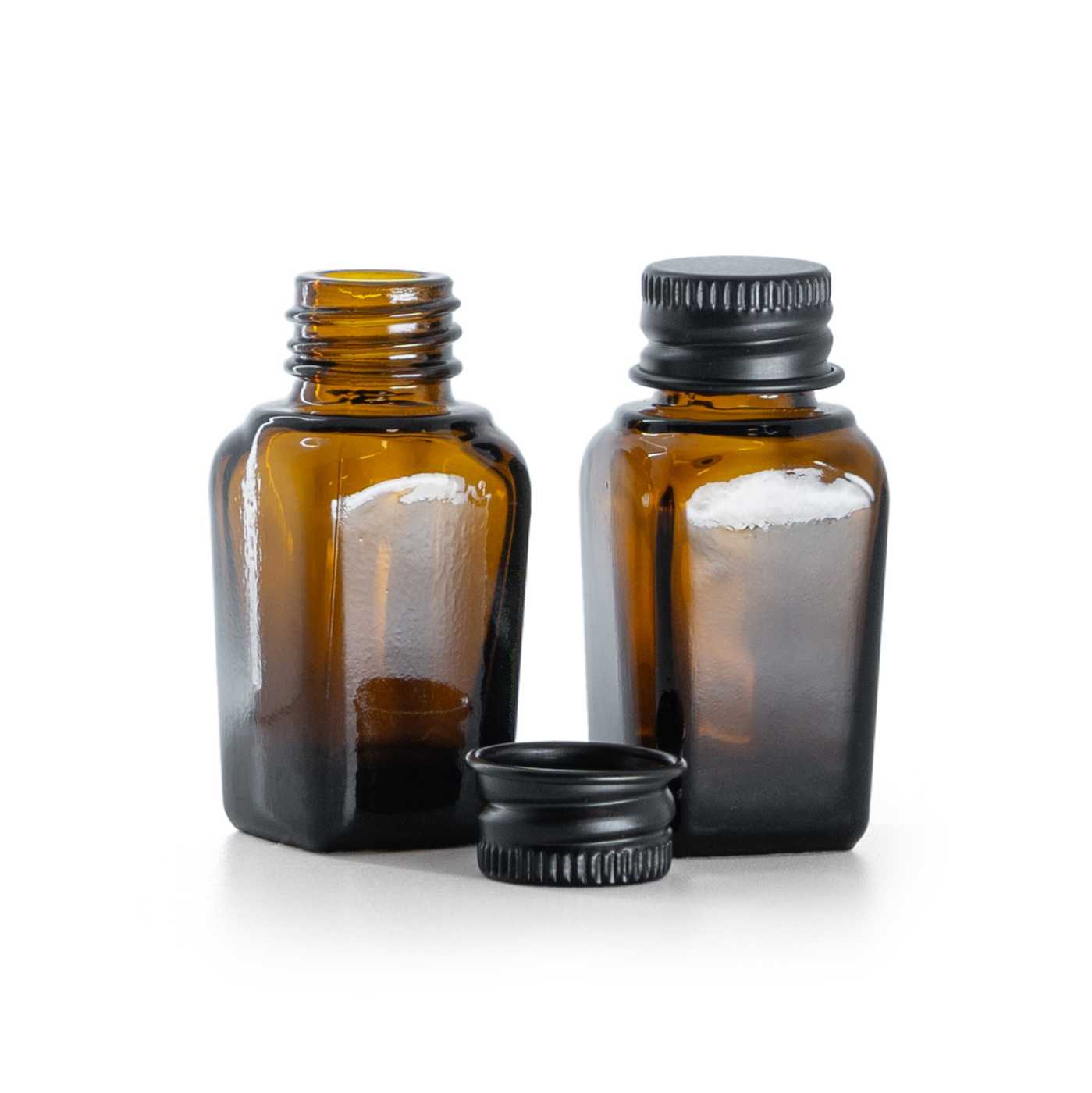 Flacon en verre, dit flacon, en verre brun. Il a une forme carrée et peut être combiné avec différents bouchons d'un diamètre de 18 mm.Volume : 10 ml