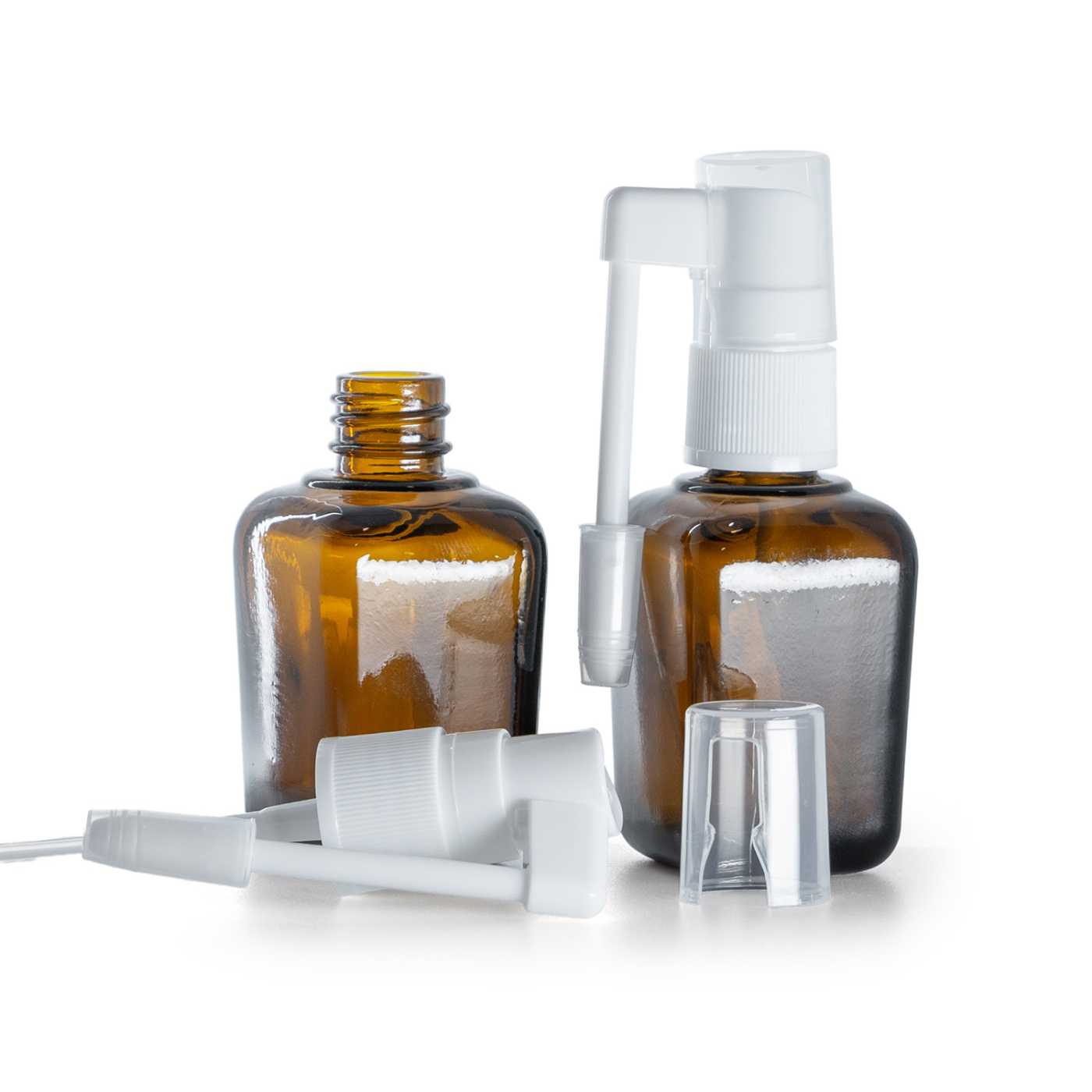 Applicateur de liquide de gorge en plastique de couleur blanche. Le spray buccal peut être utilisé avec tous les flacons en verre ayant un col de 18 mm.