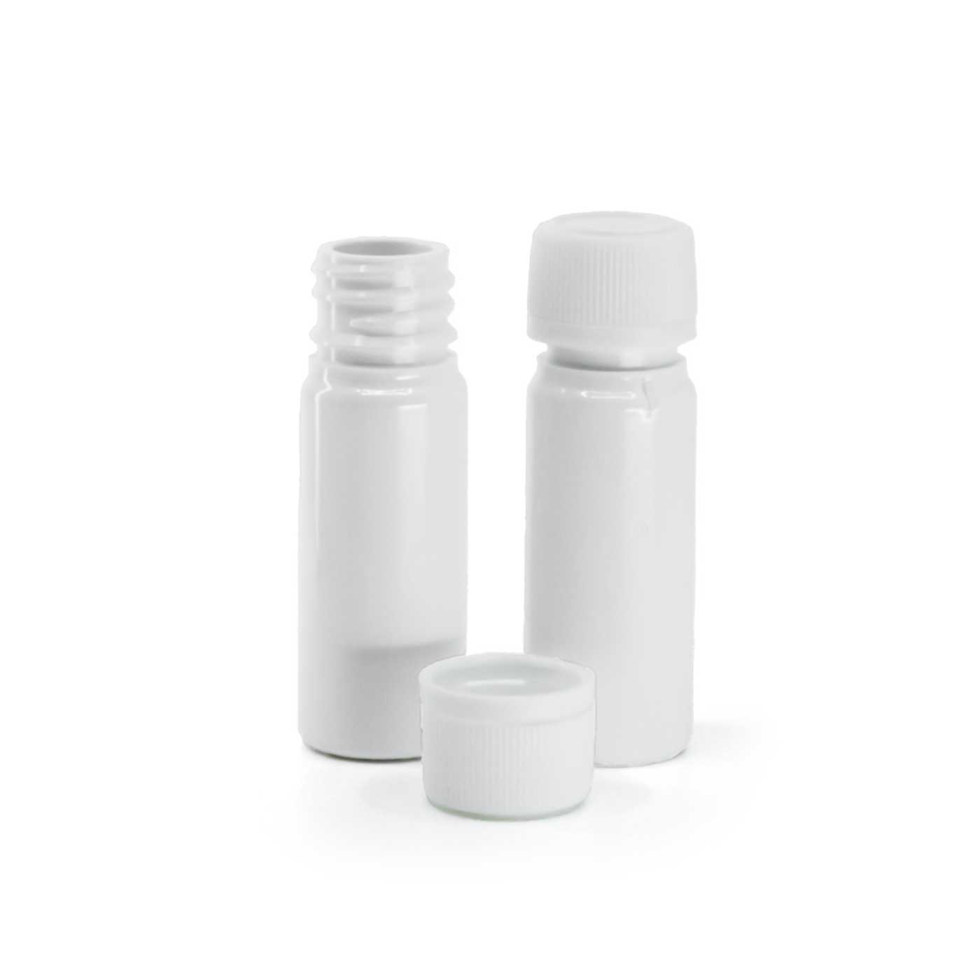 Flacon en plastique blanc, bouchon inviolable en plastique blanc, cannelé, 18/410, 10 ml