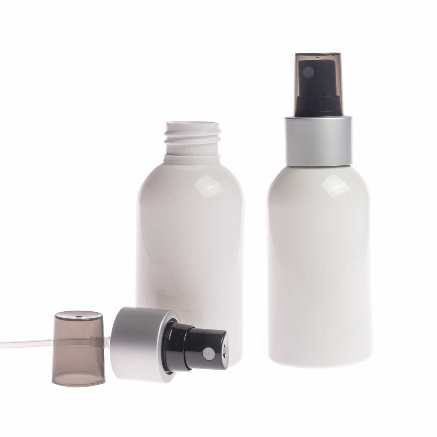 Flacon en plastique blanc, pompe spray noire, bague argent mat, 100 ml