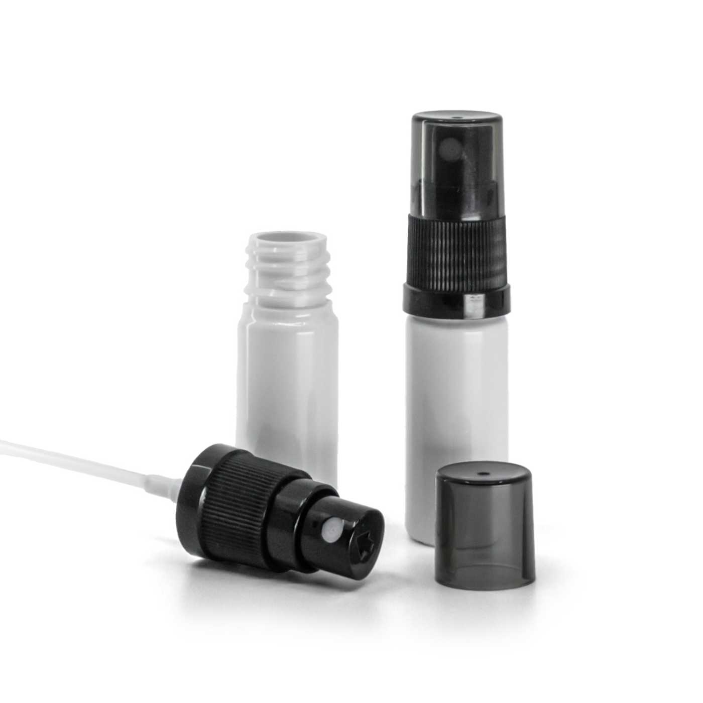 Flacon en plastique blanc, vaporisateur noir, bouchon fumé, 10 ml