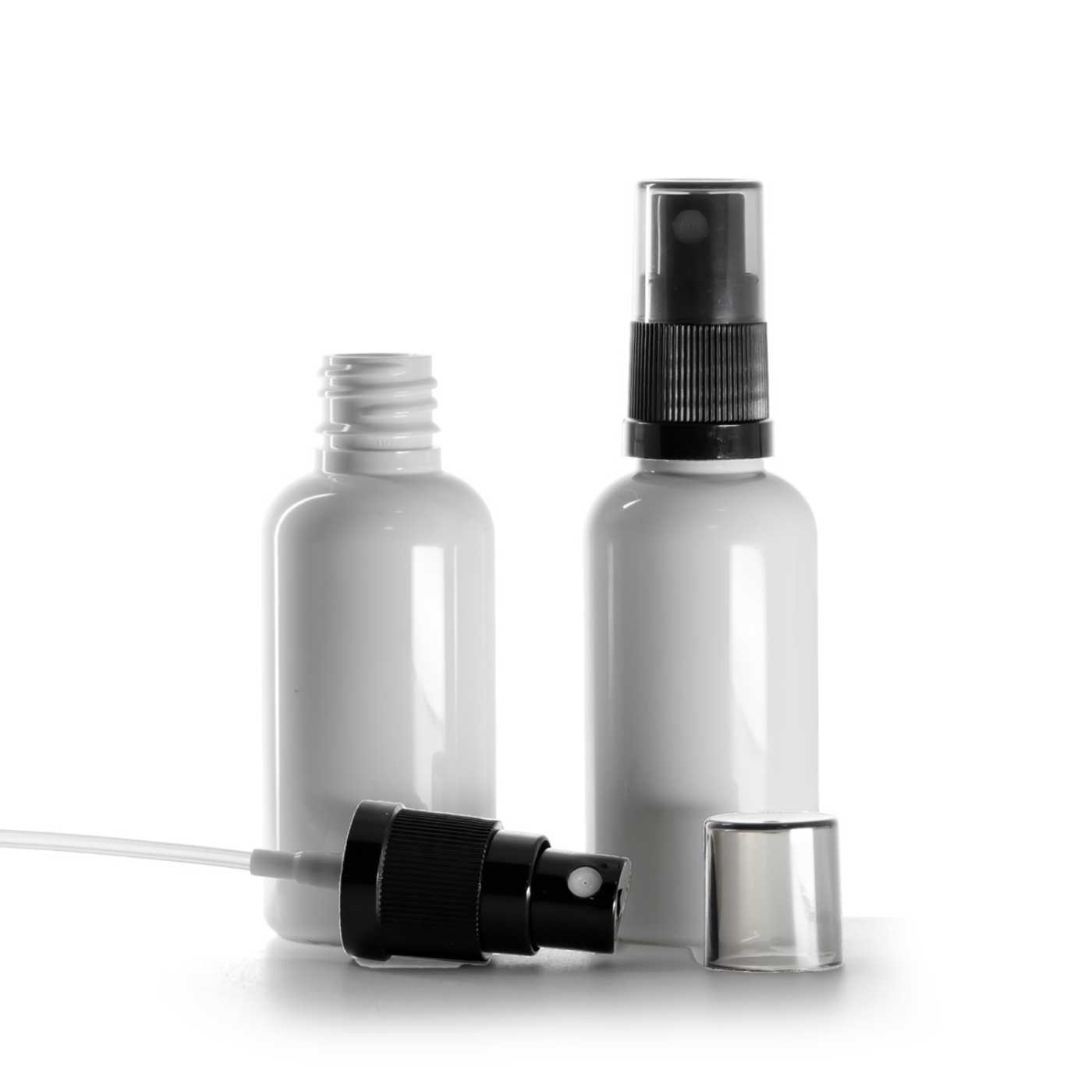 Flacon en plastique blanc, vaporisateur noir, bouchon fumé, 50 ml