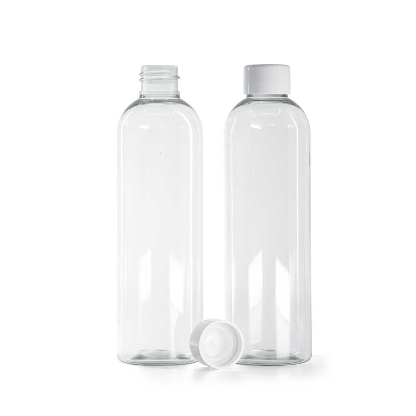 Flacon en plastique recyclé, capsule lisse blanche avec réducteur, 250 ml