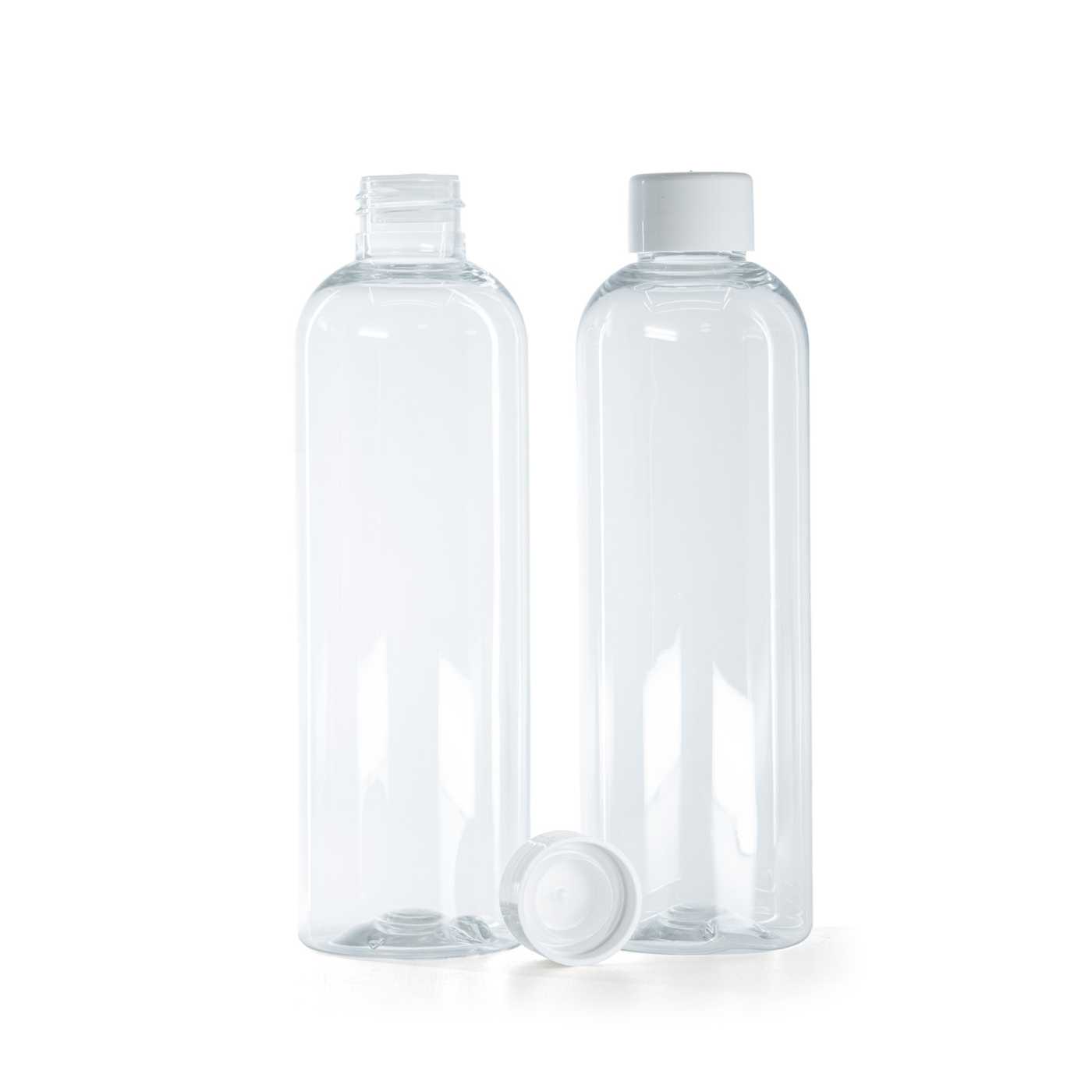 Flacon en plastique transparent, bouchon lisse blanc avec réducteur, 250 ml