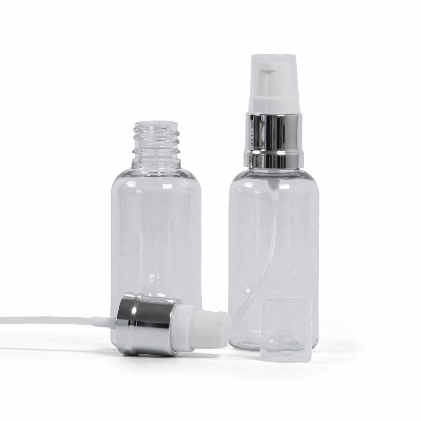 Flacon en plastique transparent, pompe brillante argentée blanche, 50 ml