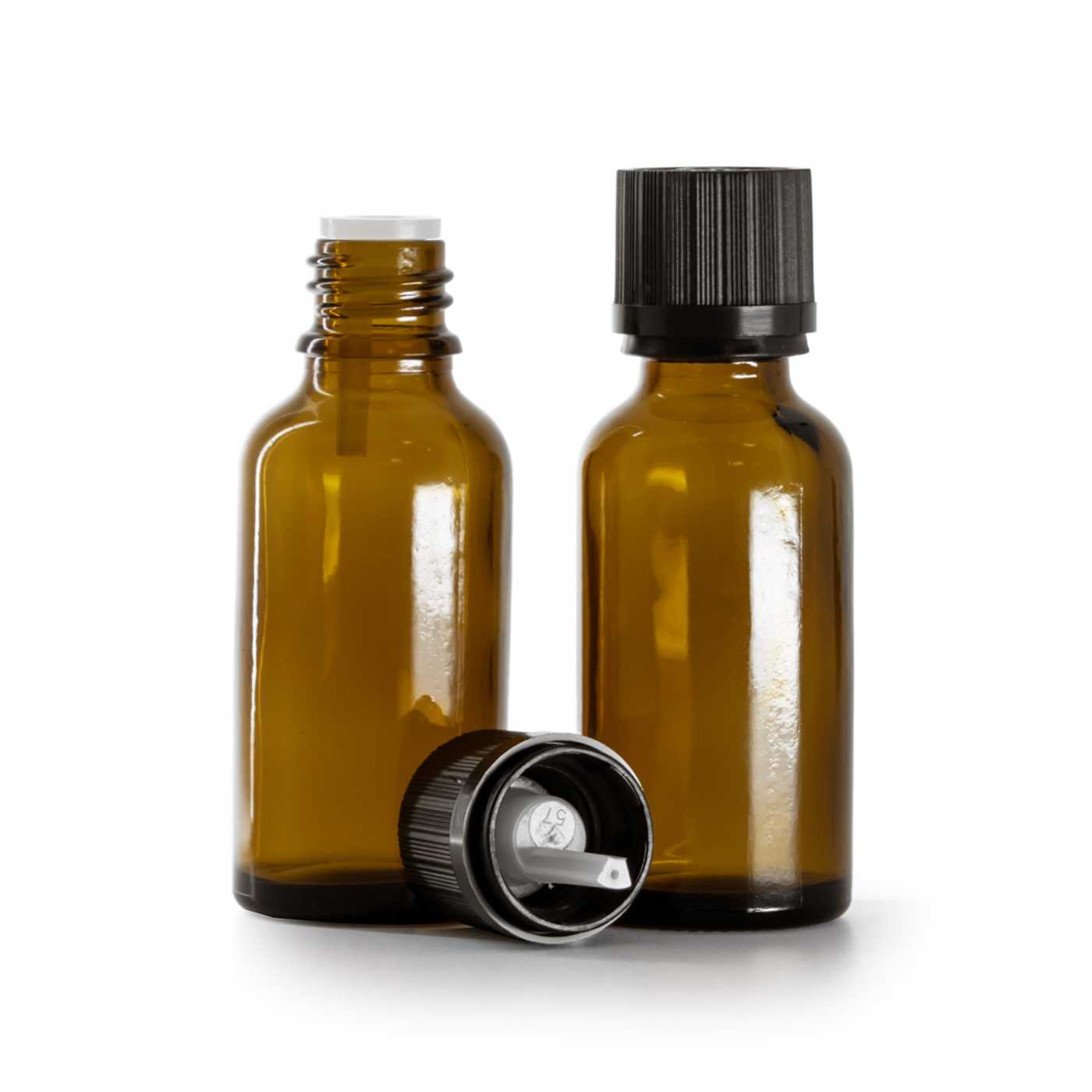 Flacon en verre ambré, bouchon de sécurité noir et compte-gouttes 30 ml