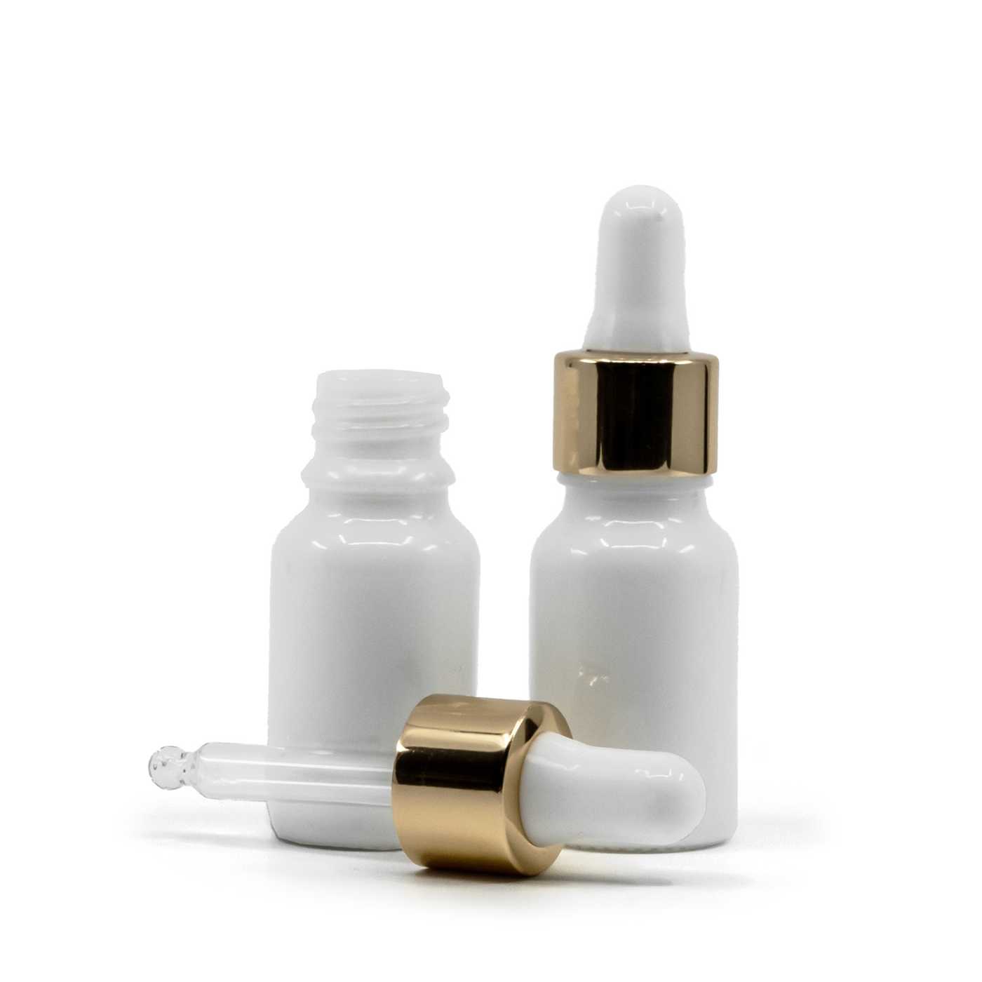 Compte-gouttes en verre blanc/doré brillant, adapté aux flacons avec un diamètre de col de 18 mm et un volume de 10 ml.