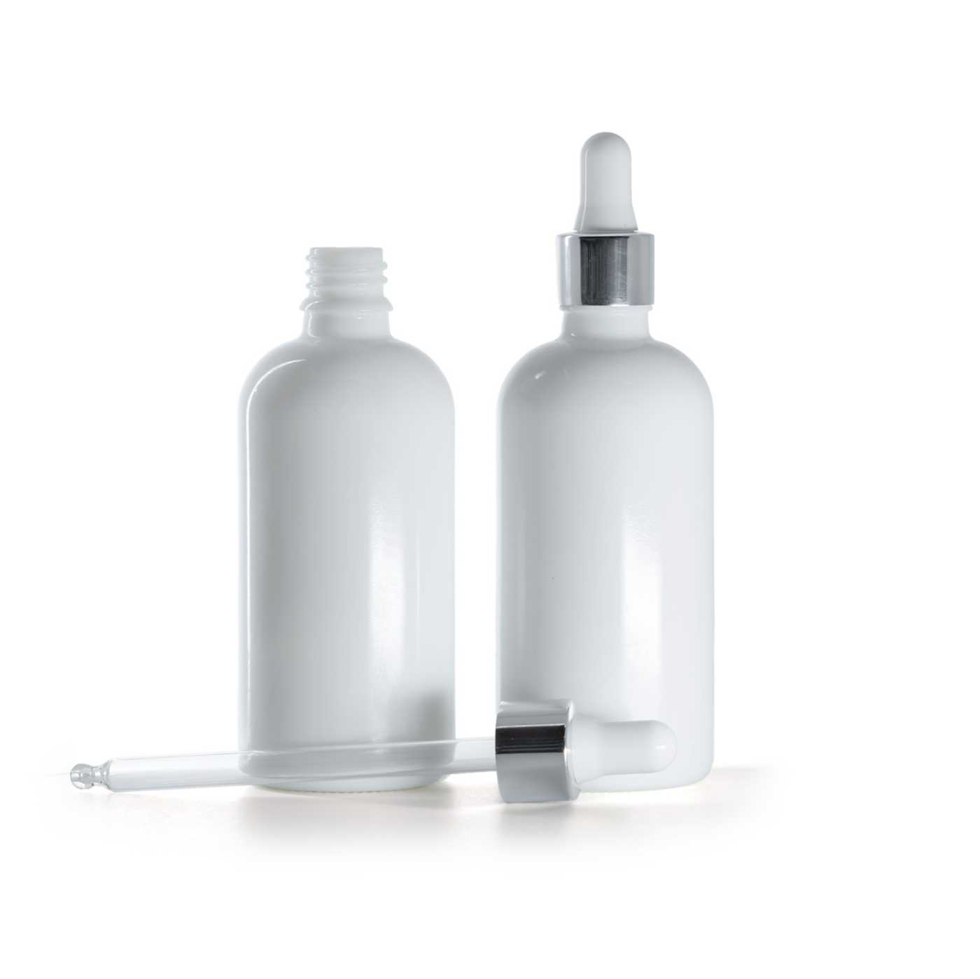 Compte-gouttes en verre, blanc/argent brillant, adapté aux flacons avec un diamètre de col de 18 mm et un volume de 100 ml.Longueur du tube en verre : 103 mmMatériau : verre, silicone, aluminium, plastique