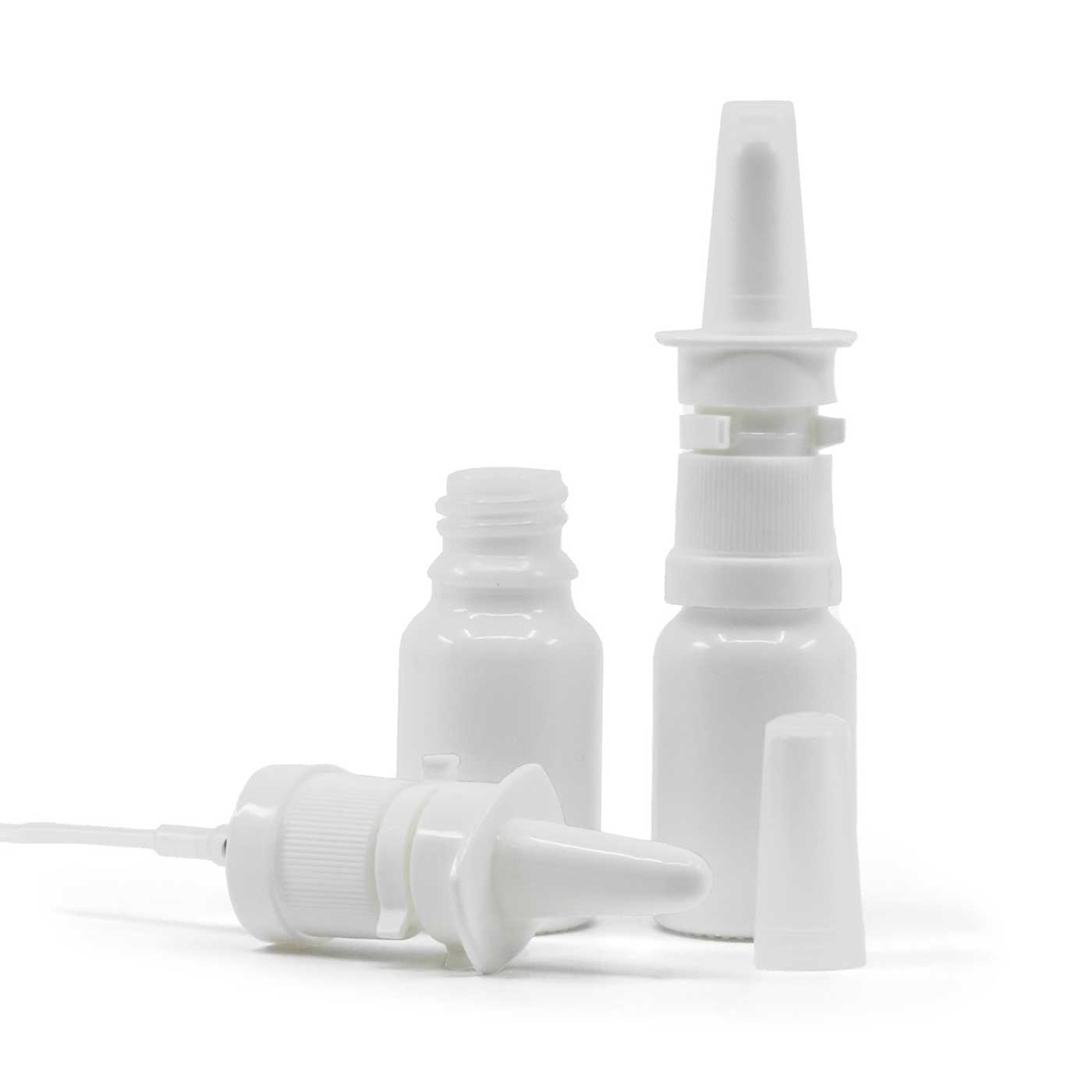 Applicateur de liquide nasal en plastique blanc. Le spray nasal peut être utilisé avec tous les flacons en verre ayant un col de 18 mm.