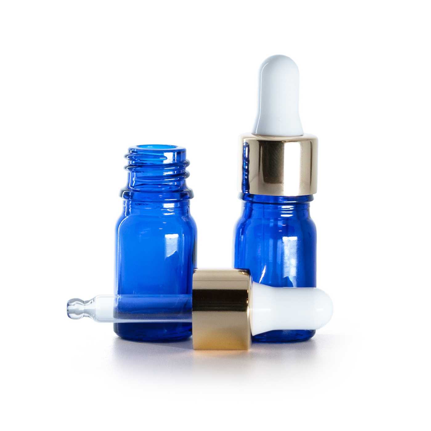 Flacon en verre bleu, compte-gouttes blanc doré, 5 ml