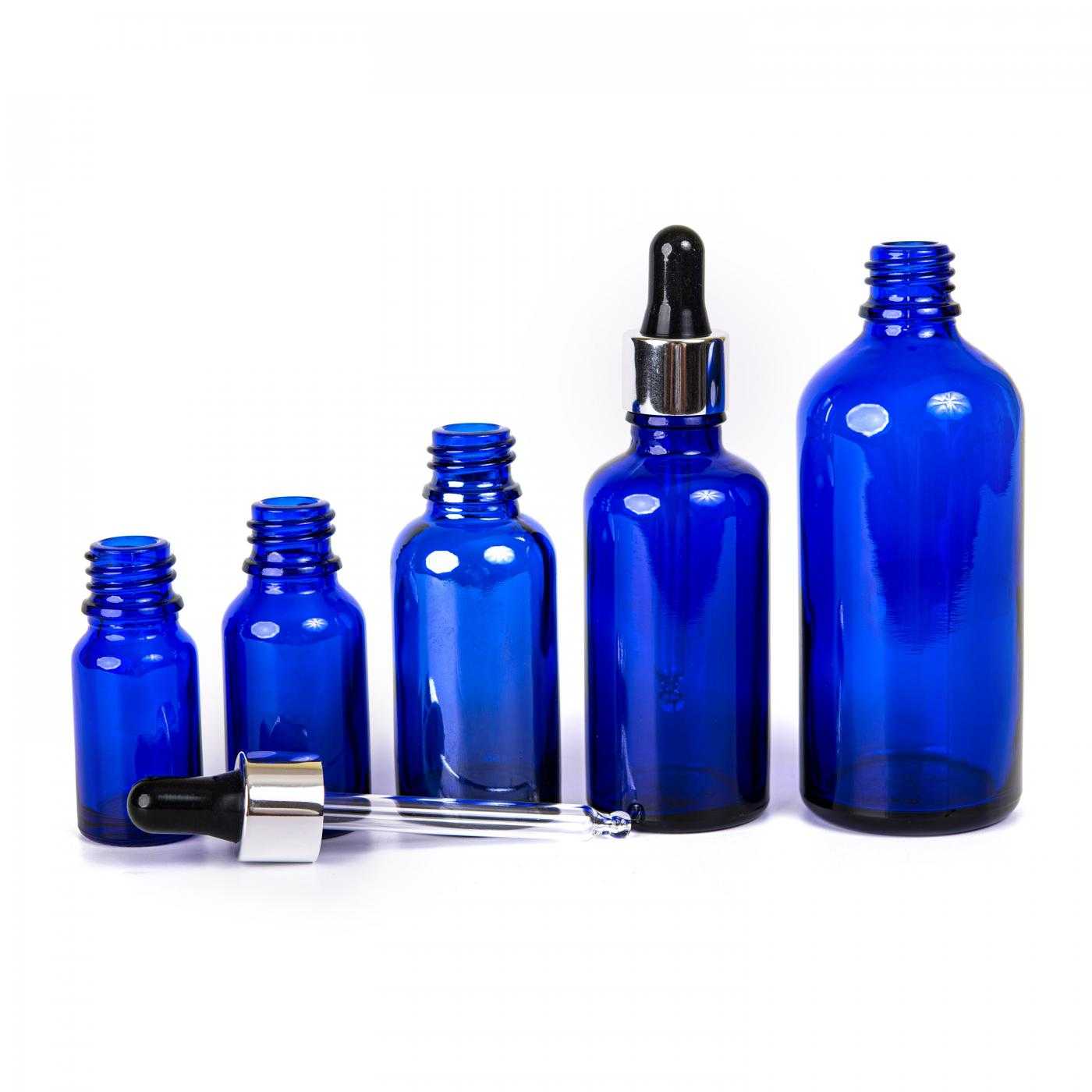 La bouteille en verre, appelée flacon, est faite d'un verre épais de couleur bleu foncé. Il est utilisé pour conserver des liquides qu'il protège efficacement de la lumière grâce à sa couleur.