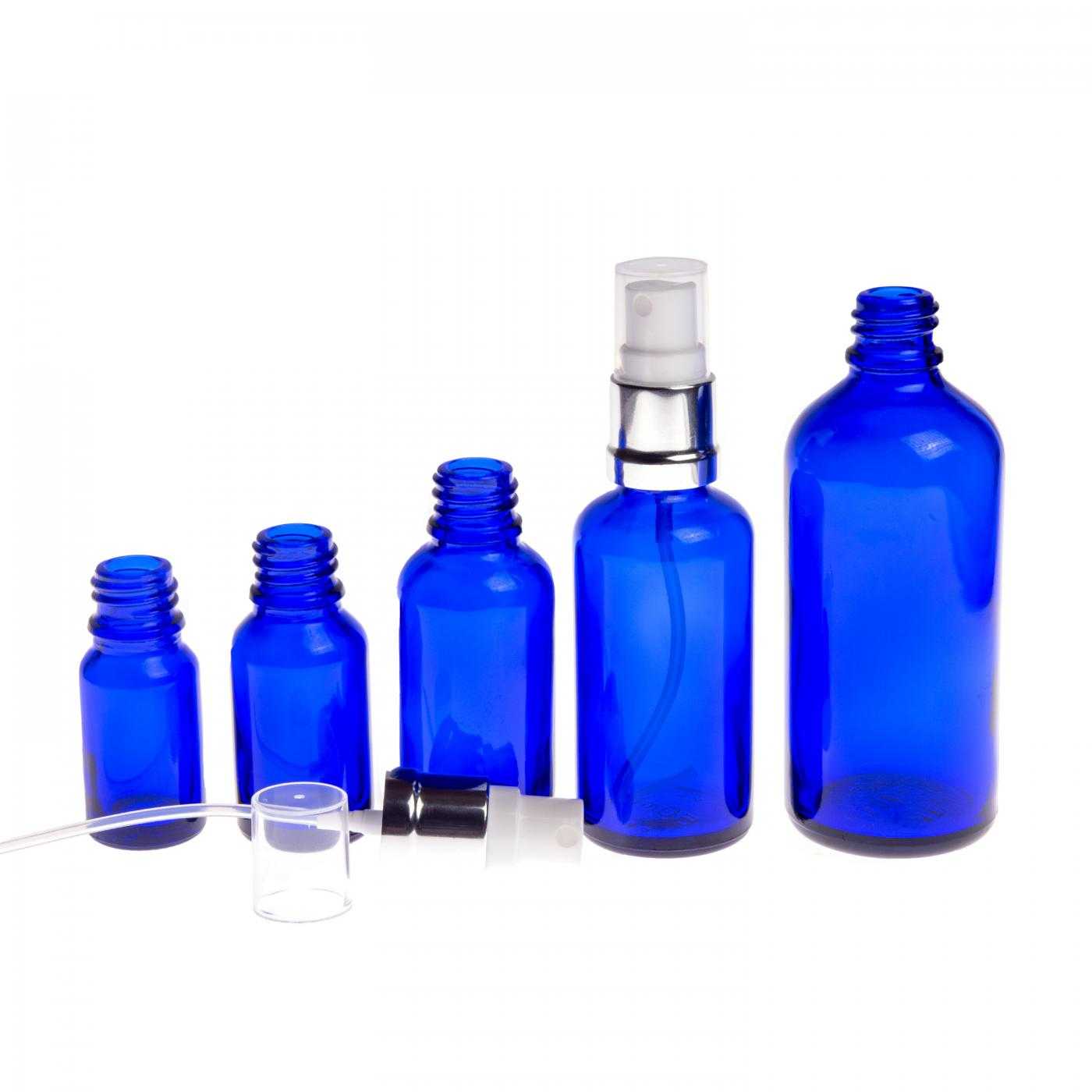 La bouteille en verre, appelée flacon, est faite d'un verre épais de couleur bleu foncé. Il est utilisé pour conserver des liquides qu'il protège efficacement de la lumière grâce à sa couleur.