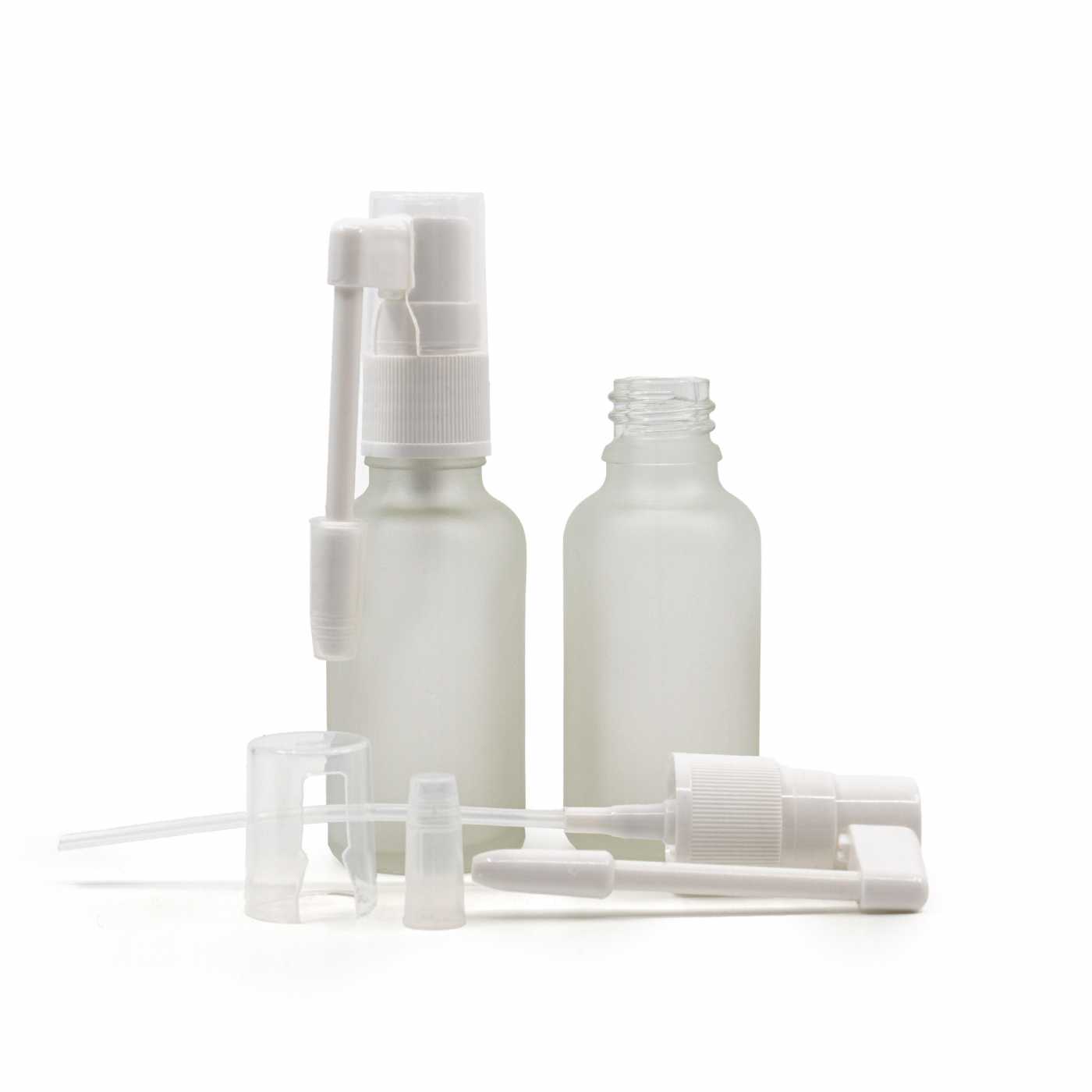 Flacon en verre givré transparent, spray oral blanc, 30 ml