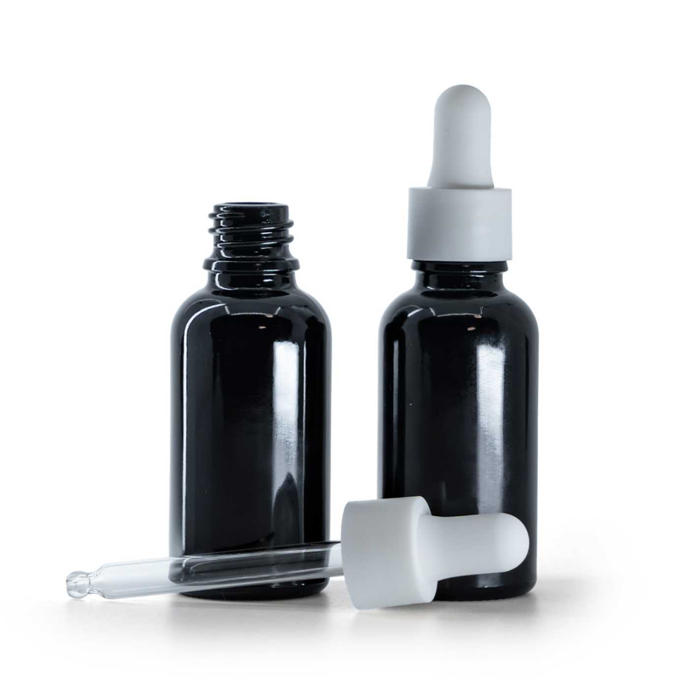 Flacon en verre noir brillant avec compte-gouttes blanc mat lisse 30 ml