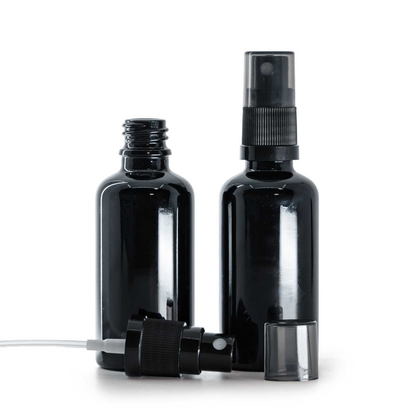 Flacon en verre noir brillant avec pompe spray noire et capot fumé, 50 ml