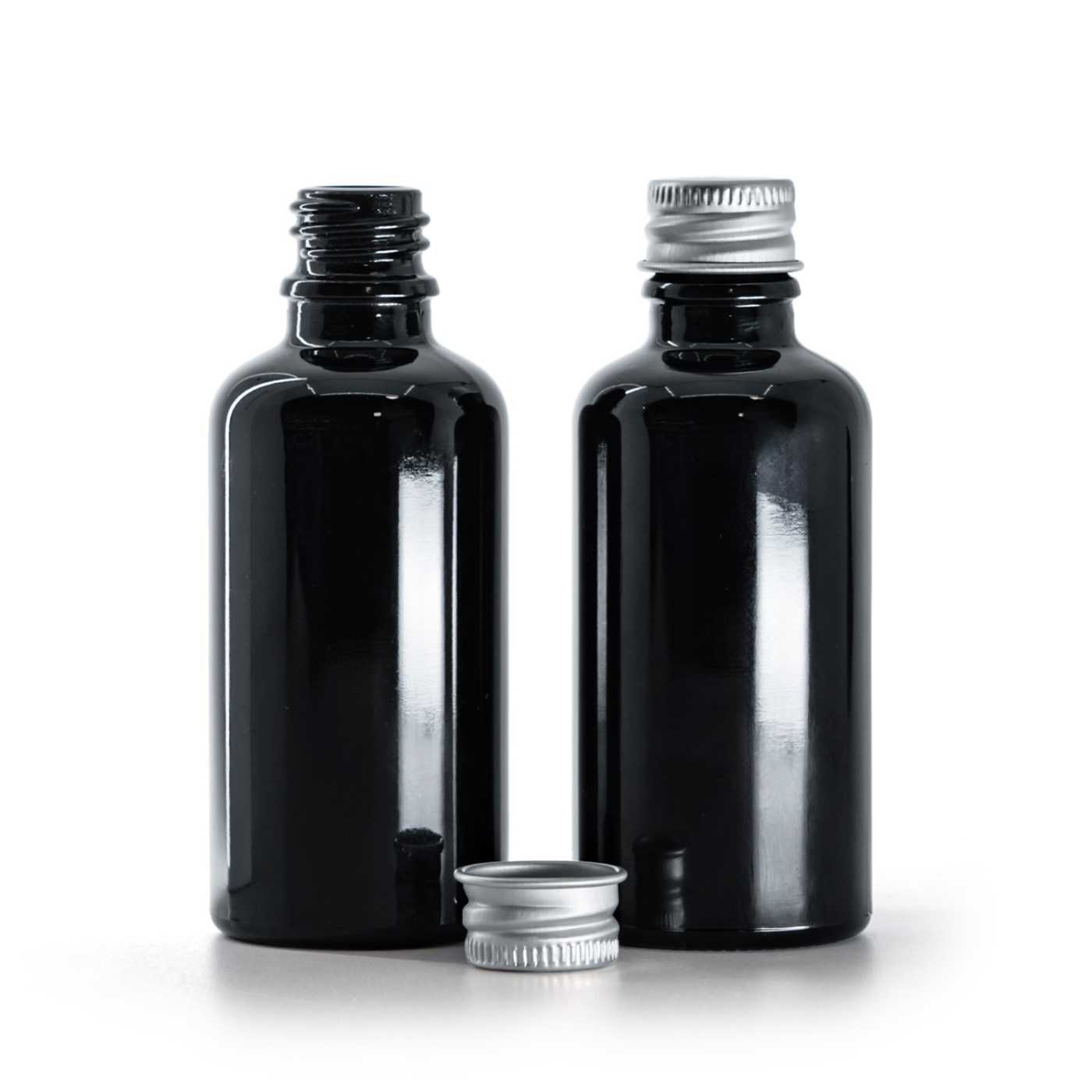 Flacon en verre noir brillant, bouchon en aluminium, 50 ml