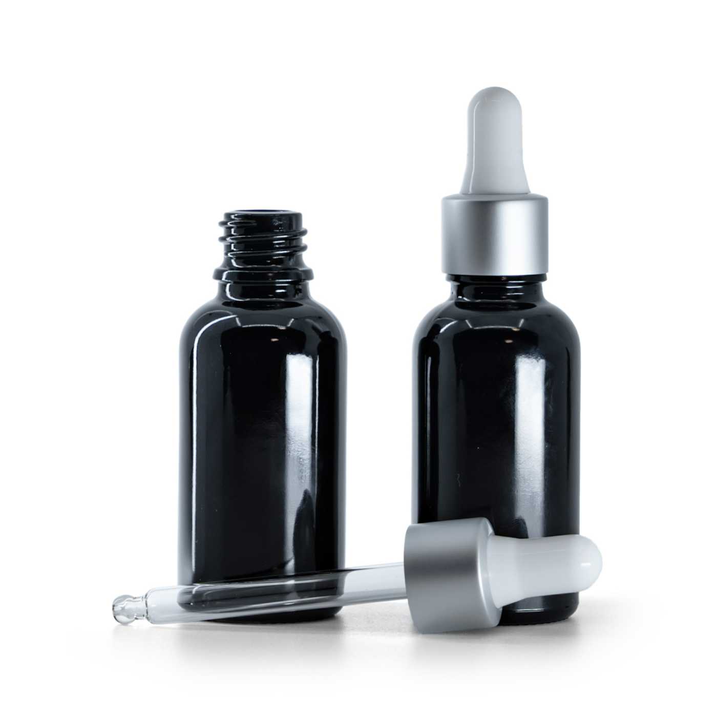 Flacon en verre noir brillant, compte-gouttes argent mat, 30 ml