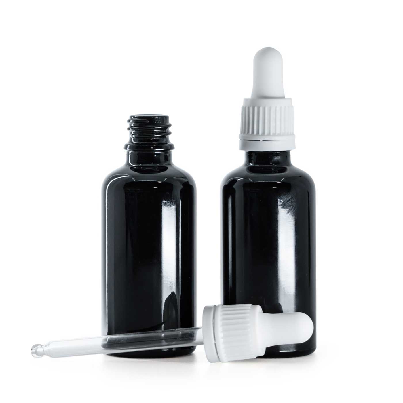 Flacon en verre noir brillant, compte-gouttes blanc, 50 ml