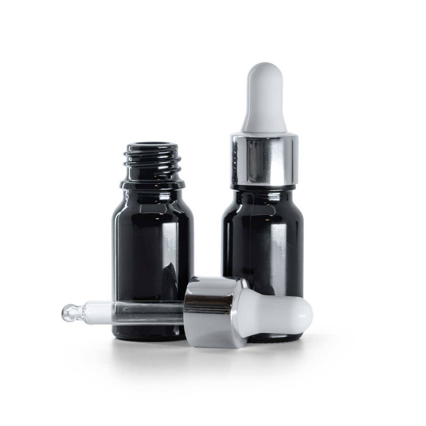 Flacon en verre noir brillant, compte-gouttes blanc argenté brillant, 10 ml