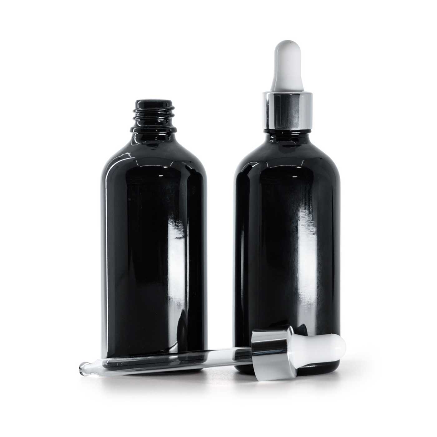 Le flaconen verre est fabriqué en verre noir de haute qualité avec une surface brillante. Cela garantit que la lumière ne pénètre pas dans le flacon et offre ainsi une protection contre les rayons UVA et UVB.
