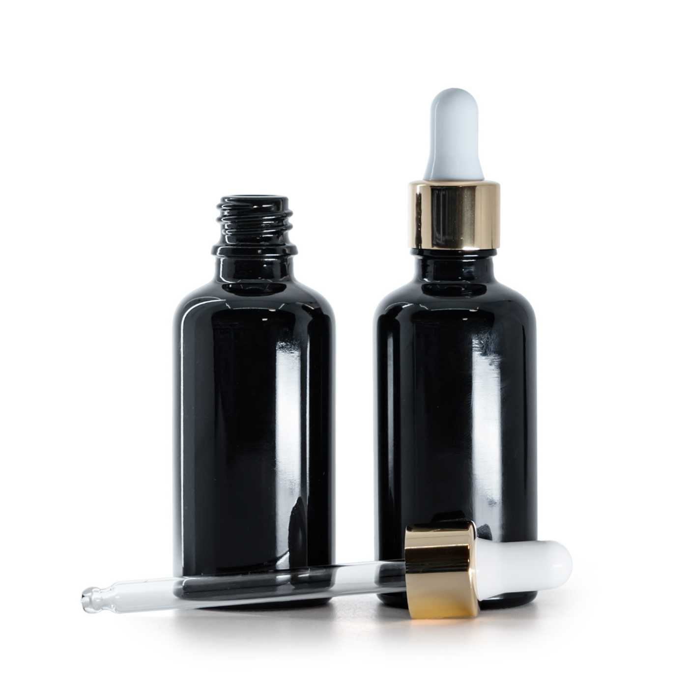 Le flaconen verre est fabriqué en verre noir de haute qualité avec une surface brillante. Cela garantit que la lumière ne pénètre pas dans le flacon et offre ainsi une protection contre les rayons UVA et UVB.
