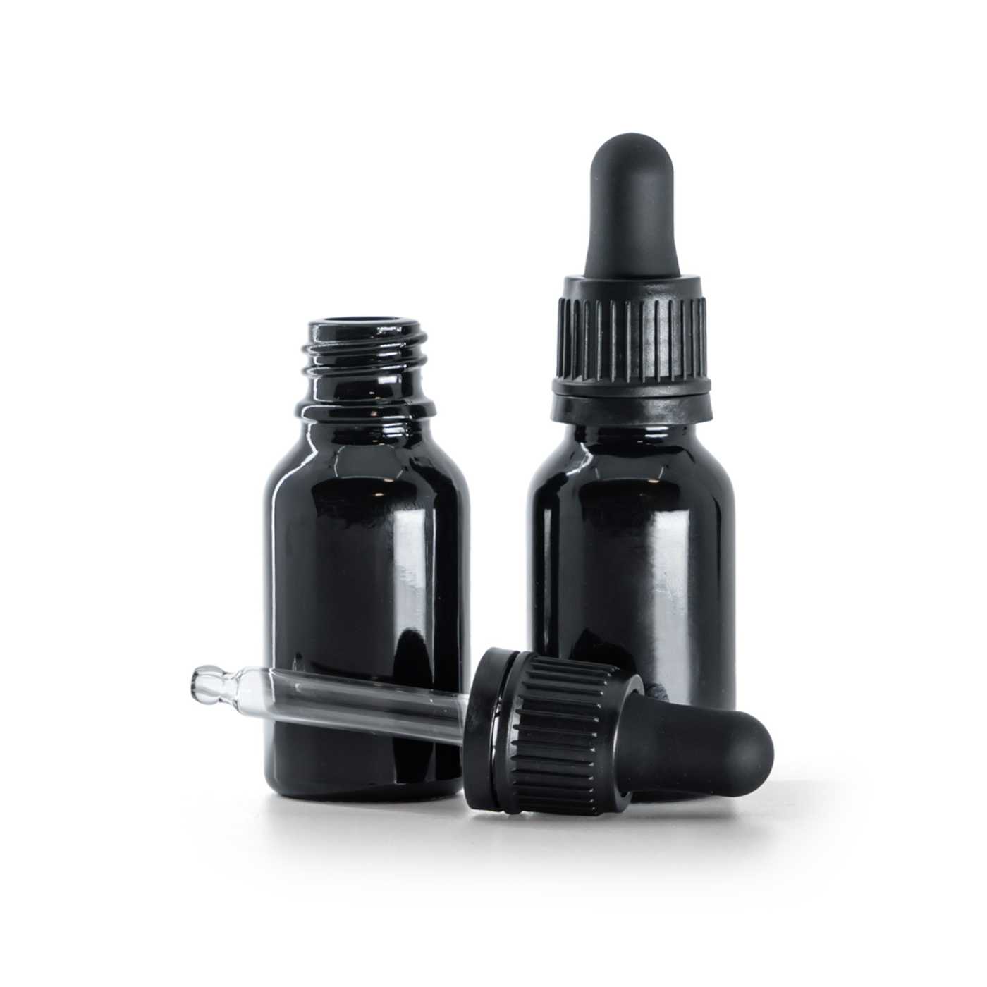 Flacon en verre noir brillant, compte-gouttes noir inviolable, 15 ml